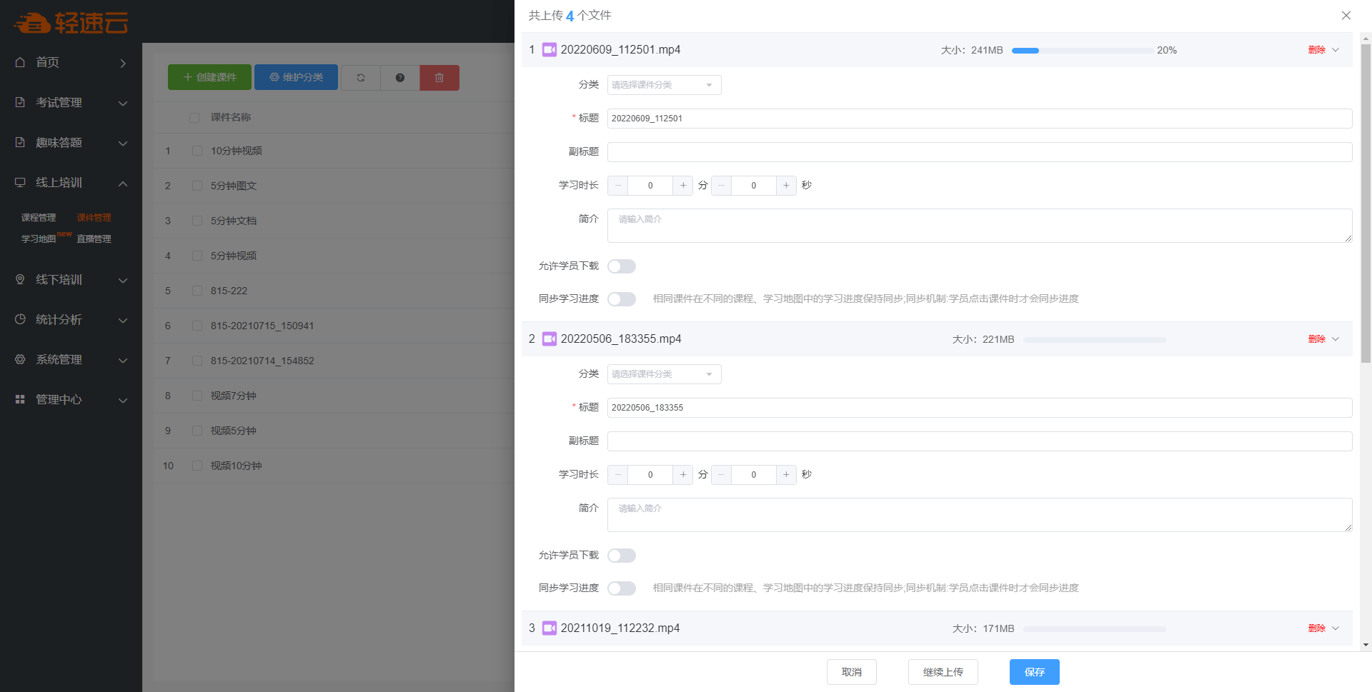 系统会自动以每个文件的文件名作为知识名称,您可进行修改。同时,还需要设置每个知识的学习时长。
