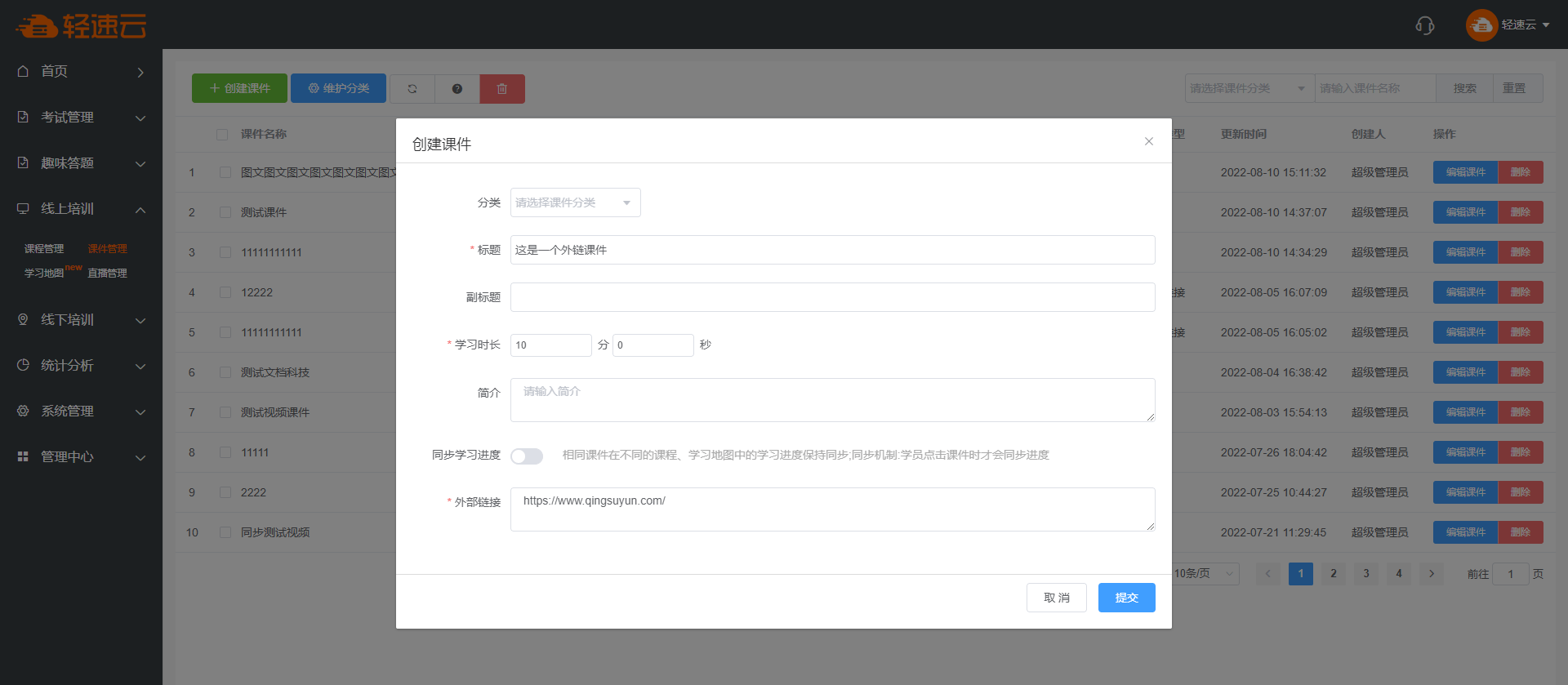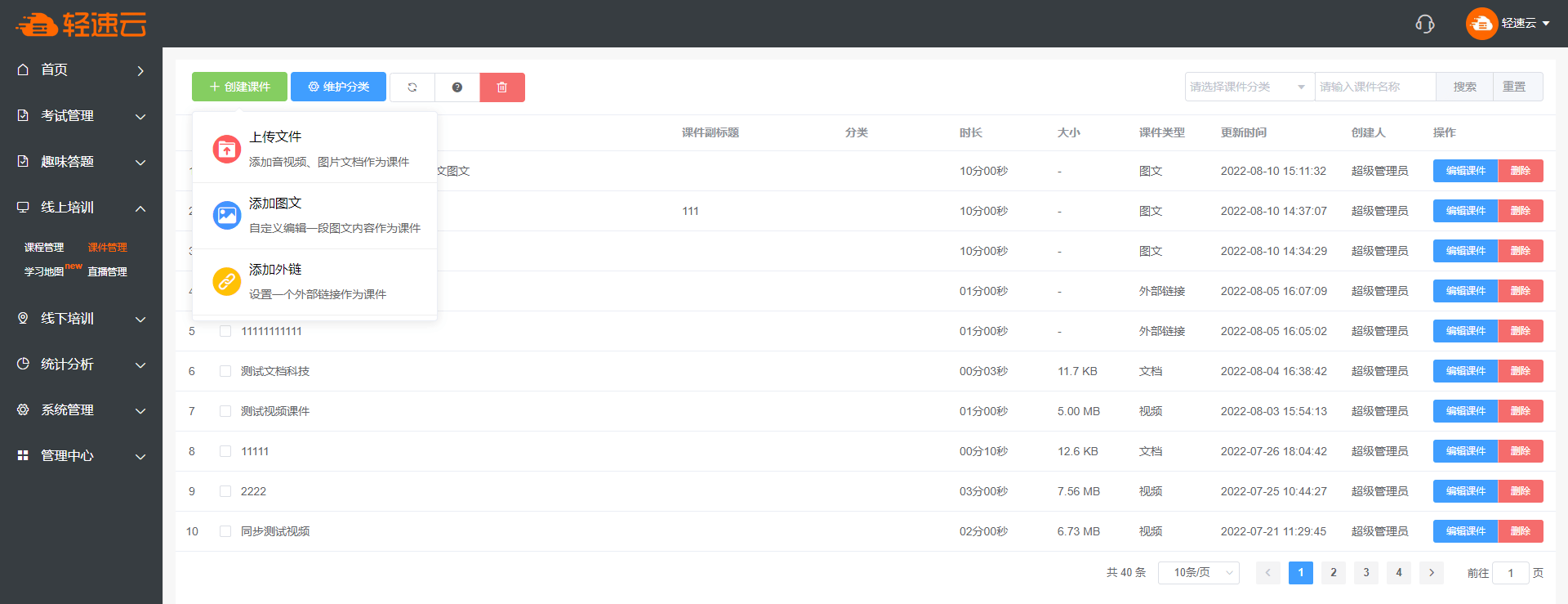知识是组成课程的基本元素,点击 线上培训 栏目下的 知识库 ,即可对知识进行操作。