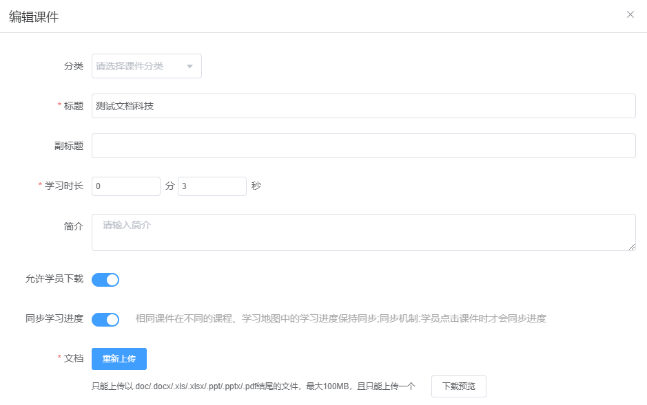 上传一个文档,只能支持word、excel、ppt、pdf文件,最大为100MB。