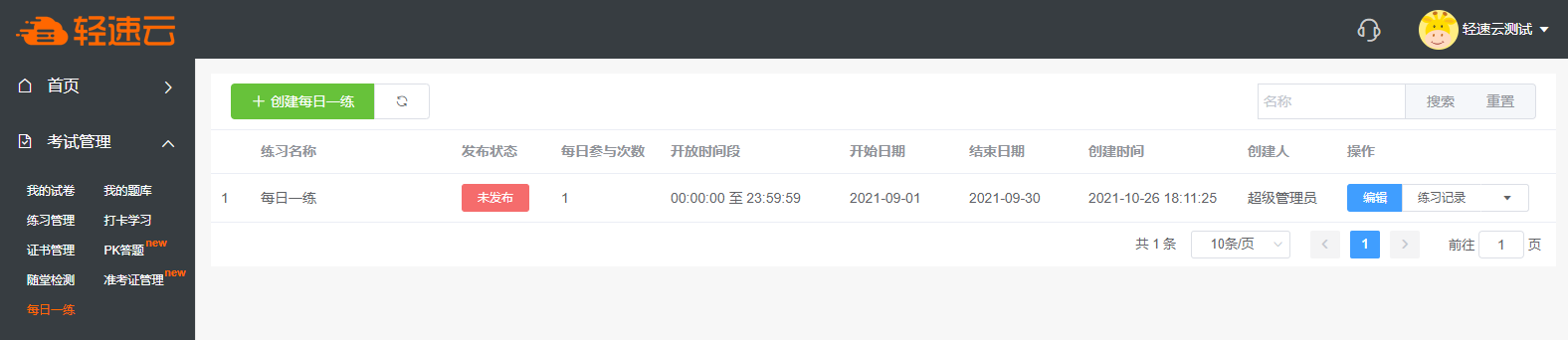 填写每日一练的基本信息并保存后,即可创建成功,创建完成后进入编辑页面,需要进一步设置每日一练的题目、规则等详情。