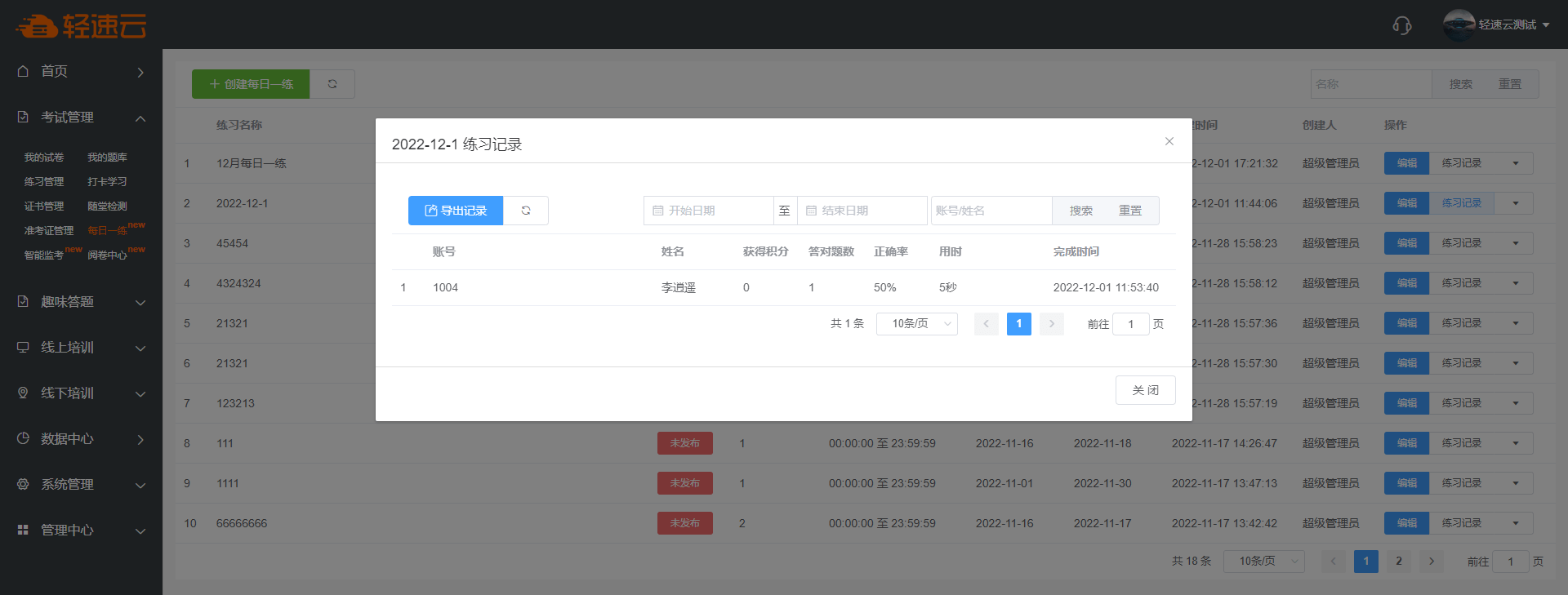 当成员完成每日一练后,管理员可通过练习记录来查看成员的练习情况。