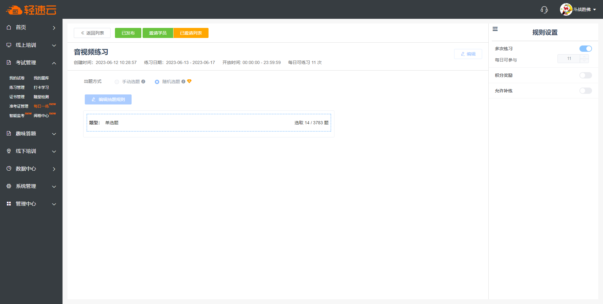 随机选题的模式下无需设置关联课件,只需要配置随机抽题规则,系统会自动根据规则生成每个成员的练习题目,不同成员之间获取的练习题目不一定相同。