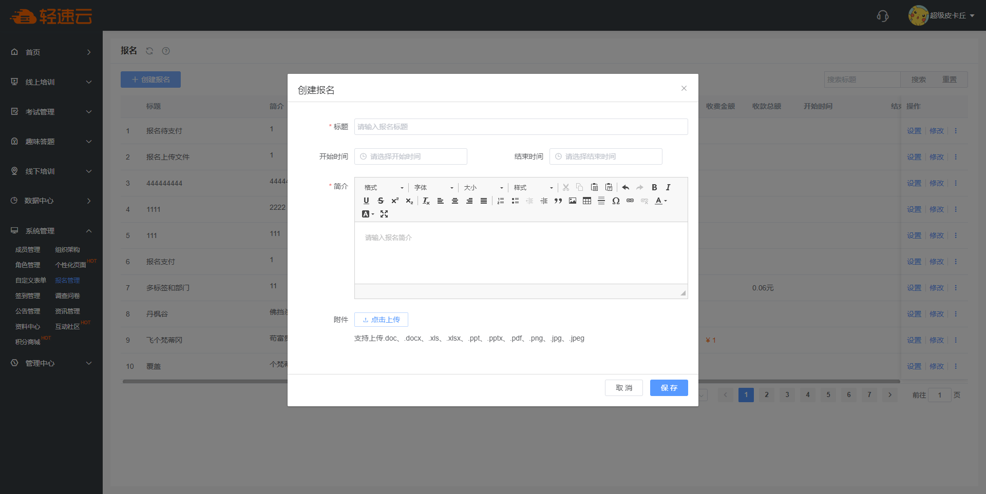 点击系统管理栏目中的 报名管理 进入到报名列表,已创建的报名信息会在列表中展示。