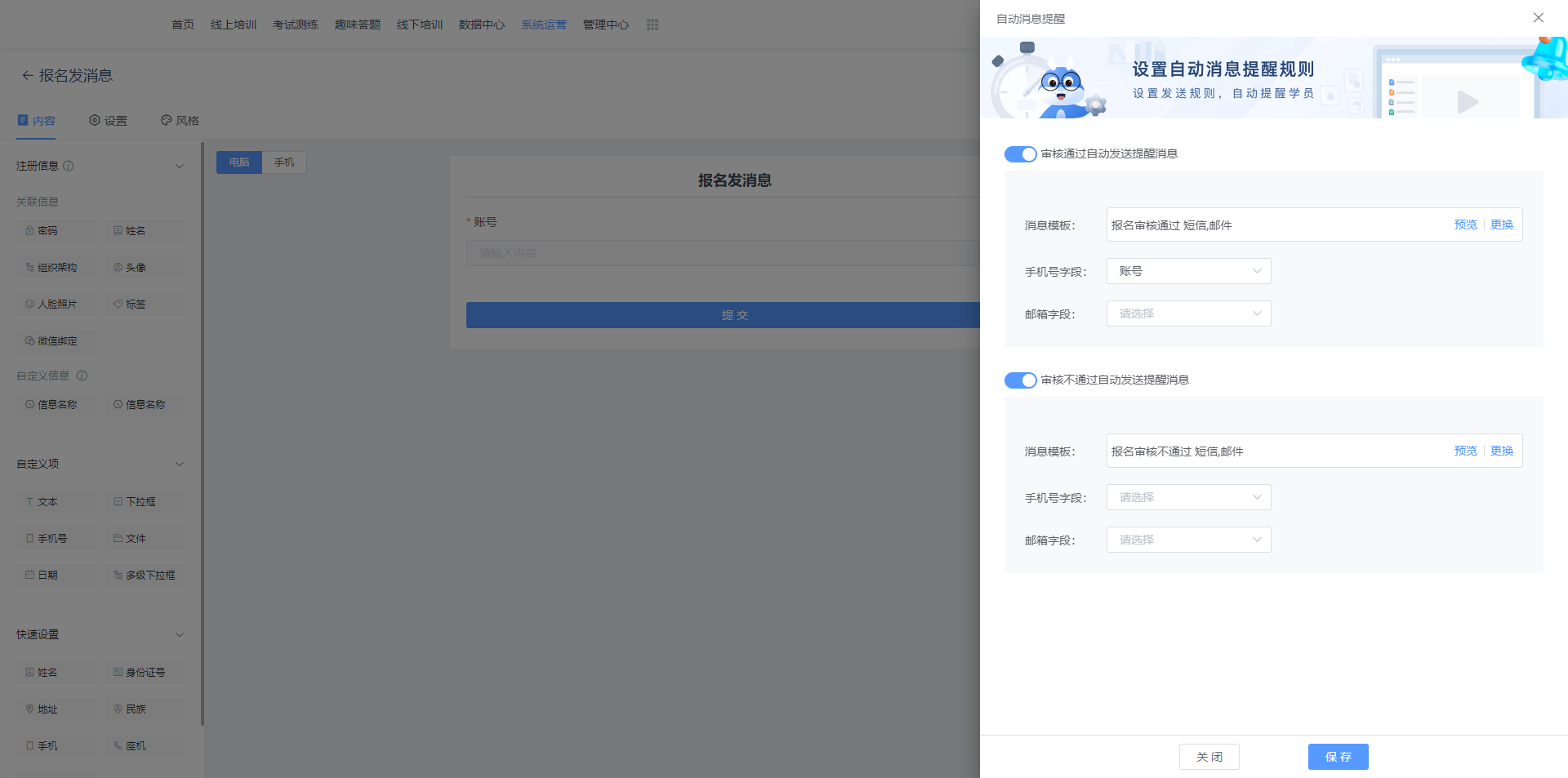 发送短信和邮件消息时,报名内容中需添加对应字段,系统会以该字段的数据进行消息发送,错误的信息会被自动忽略。
