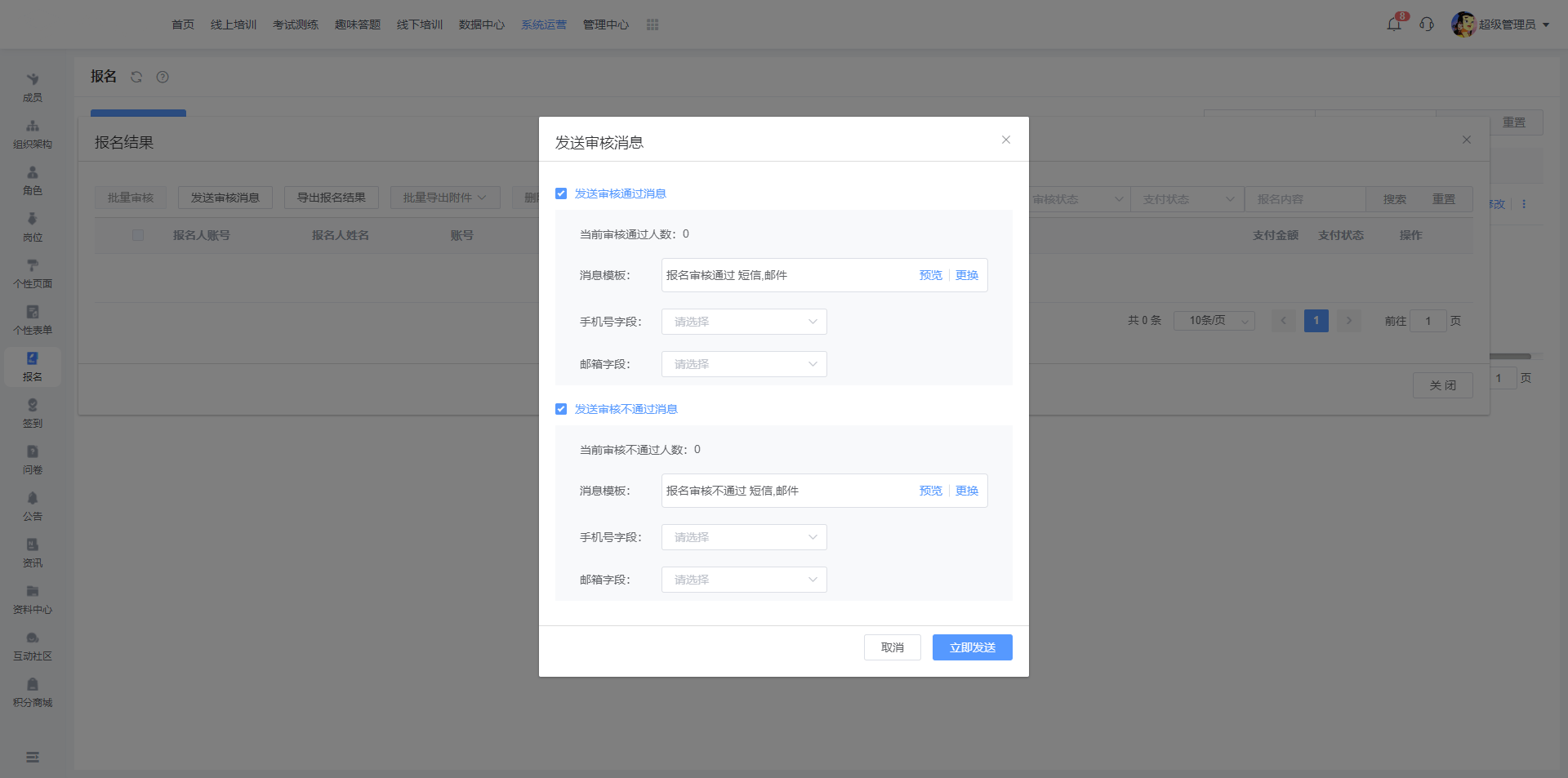 在报名结果中,点击 发送审核消息 能够立即发送审核通过或审核不通过的对应消息,无需审核的报名项目不能发送消息。
