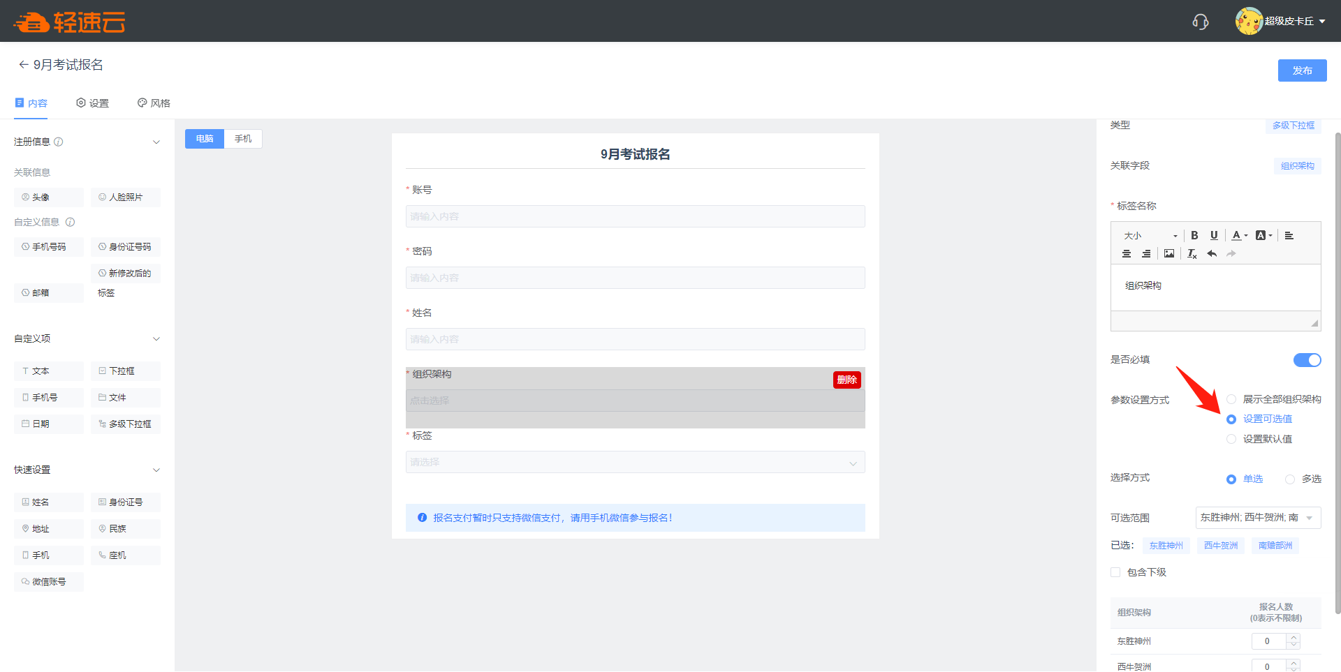 报名内容中添加的 组织架构 和 标签 采用 可选值 设置时,将启用特殊功能。
