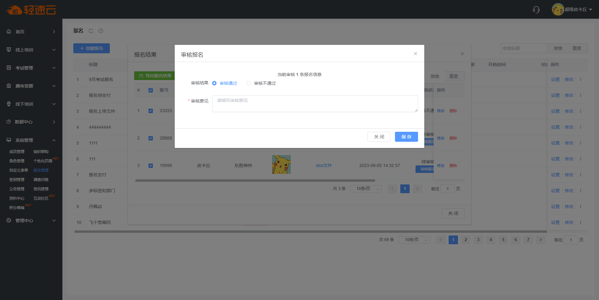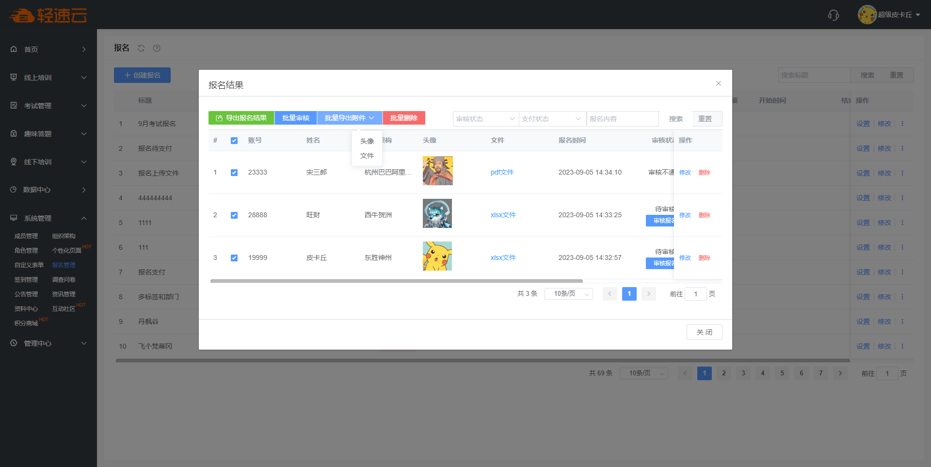 管理员能够在报名结果列表中进行审核、导出等相关动作。