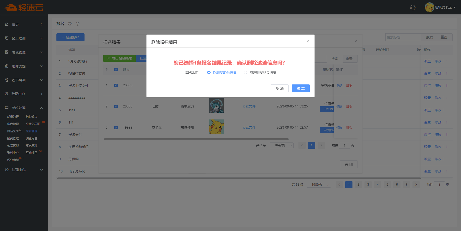 除编辑外,管理员也能够直接在报名结果列表中删除对应信息。