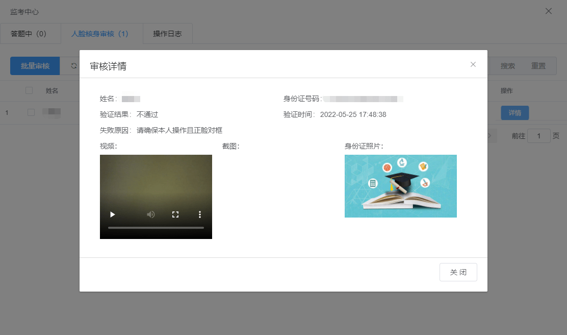 若考试启用了 人脸识别 功能且允许人工审核时,管理员在监考中心点击 人脸识别审核 能够处理考生发起的人工审核请求。若某考生审核通过,该考生即可正常进入考试。
