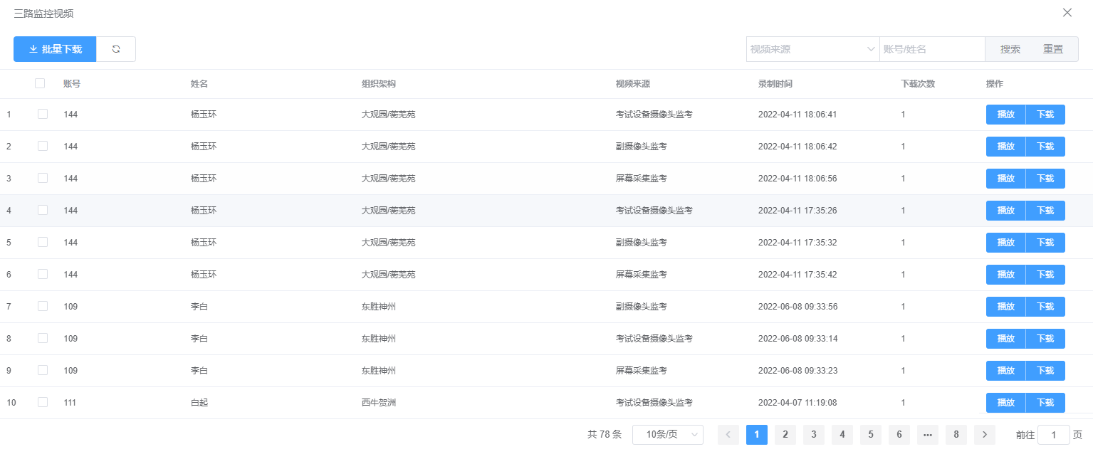 打开监考中心,在弹出的页面右上角点击 监控视频 按钮,系统会展示所有考生的监控视频列表,勾选需要下载的视频,然后选择 批量下载 即可。监控视频会下载到浏览器模版的下载位置。