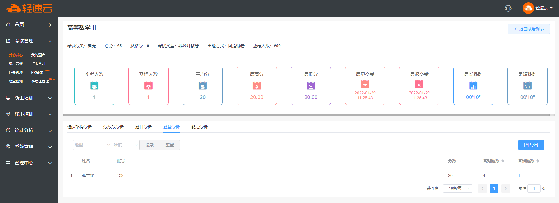 在试卷分析页面中,可以从多个维度对考试进行综合分析,并导出相关的结果报表。