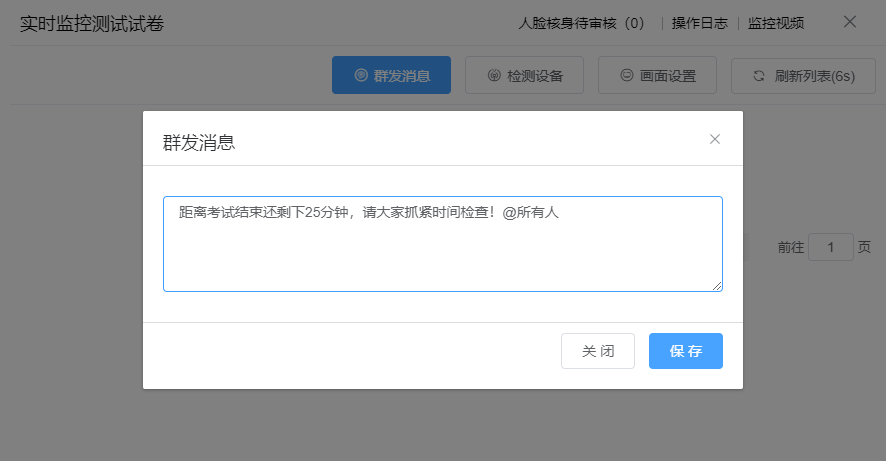 管理员能够对所有考生群发消息,点击 群发消息 按钮,填入消息内容,即可将其发送给正在考试的考生。发送消息时,能够编辑并保存一些消息发送模版,下次发送时可以直接发送模版消息。