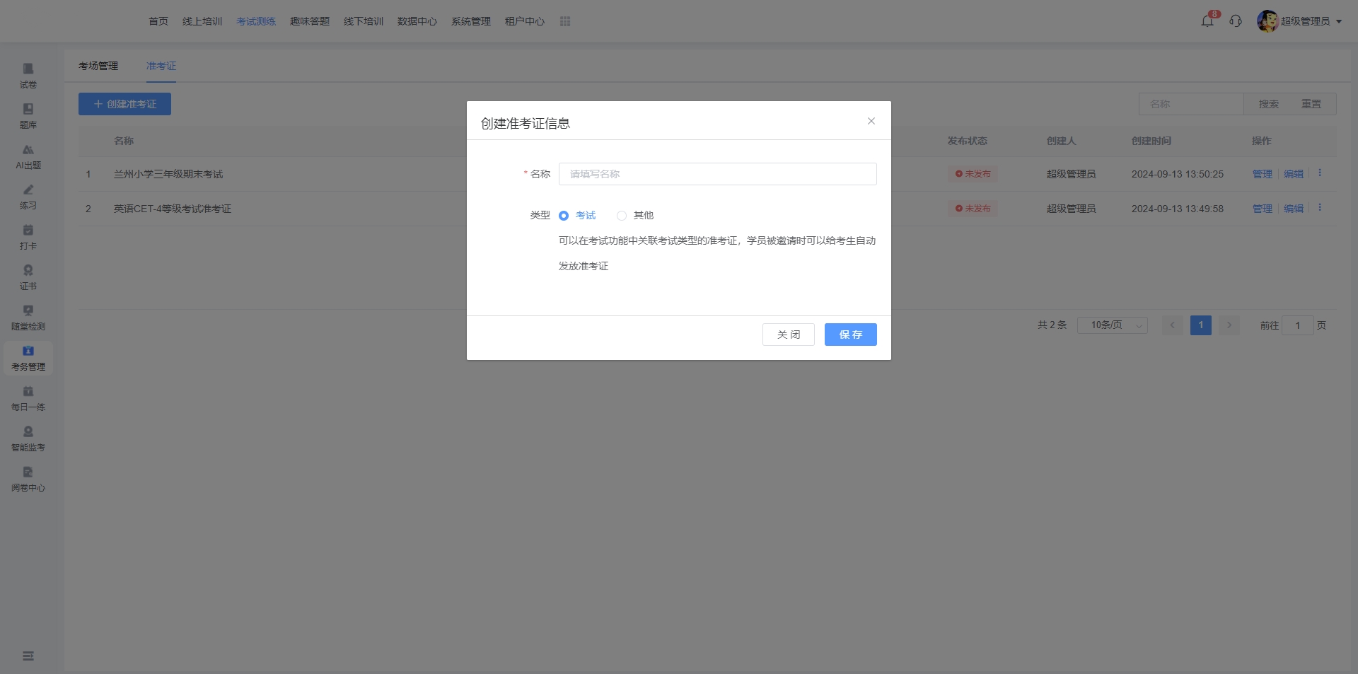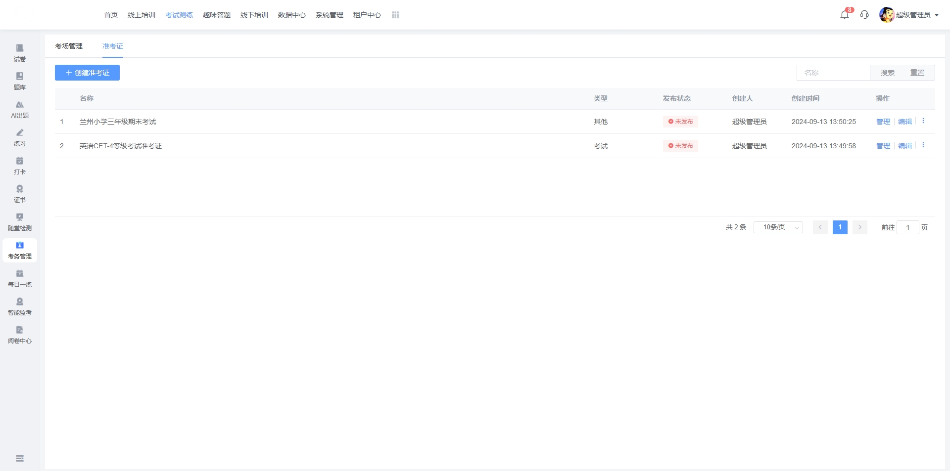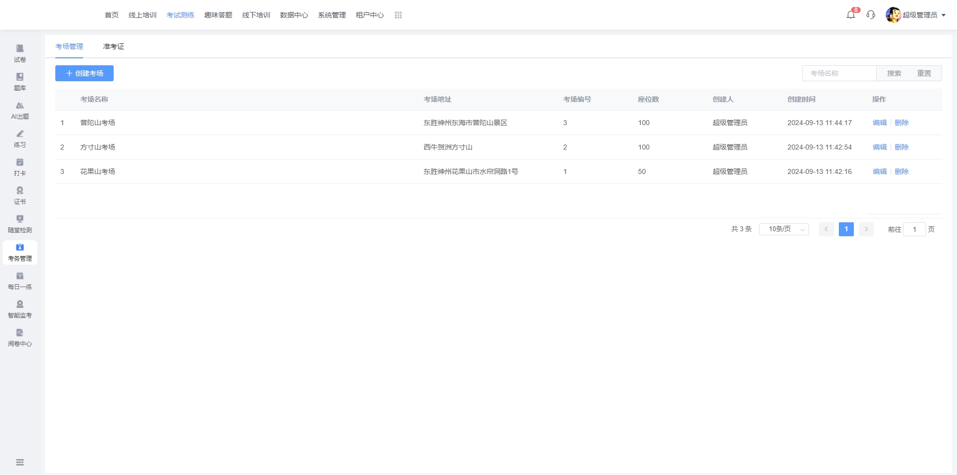 考场管理用于创建考场信息,在考试准考证中会使用到该信息。考场仅供展示,没有实际的作用。