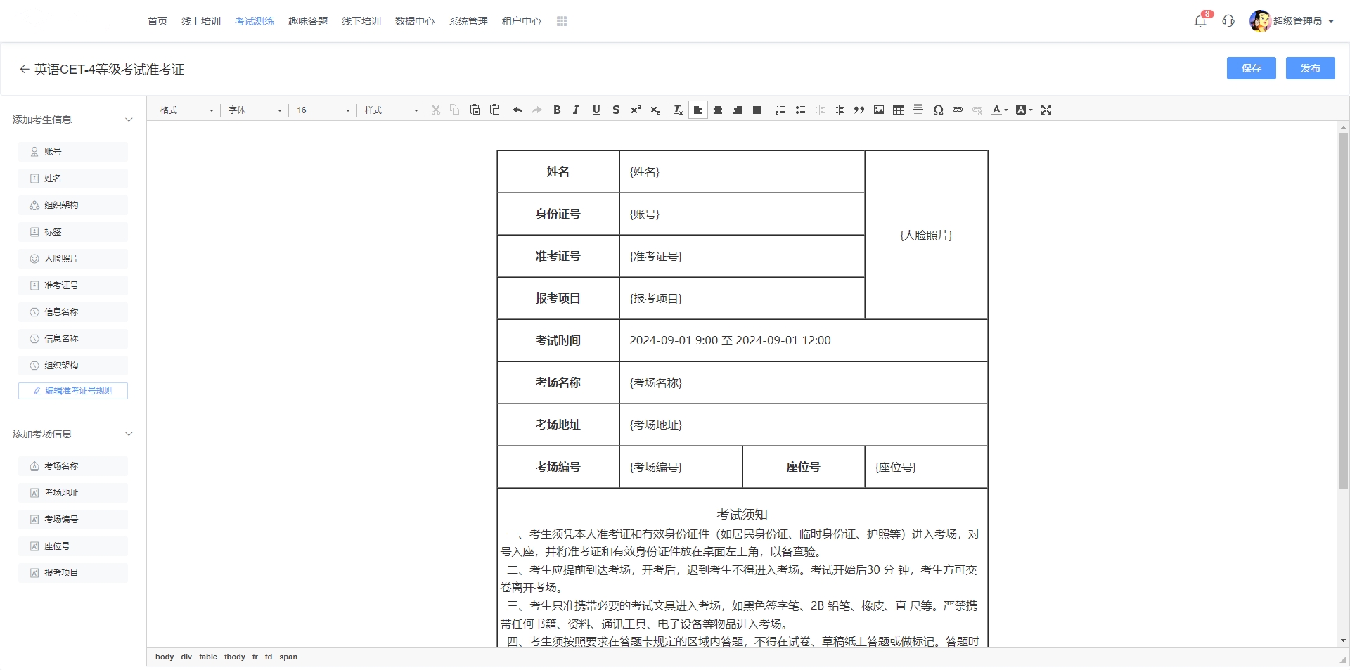 点击左侧模块,能够在准考证中增加对应信息字段。准考证预览区域为富文本编辑器,支持直接进行样式或内容的编辑。