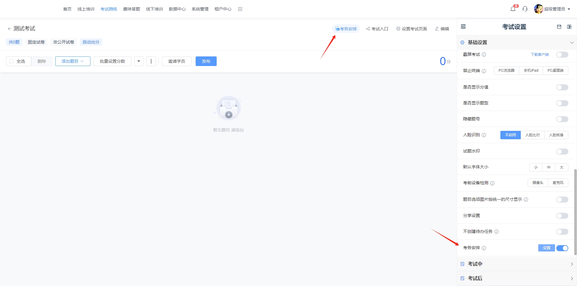 考试设置中能够启用 考务安排 ,打开该功能后,试卷编辑页面的顶部也会出现考务安排的快捷入口,便于设置调整。