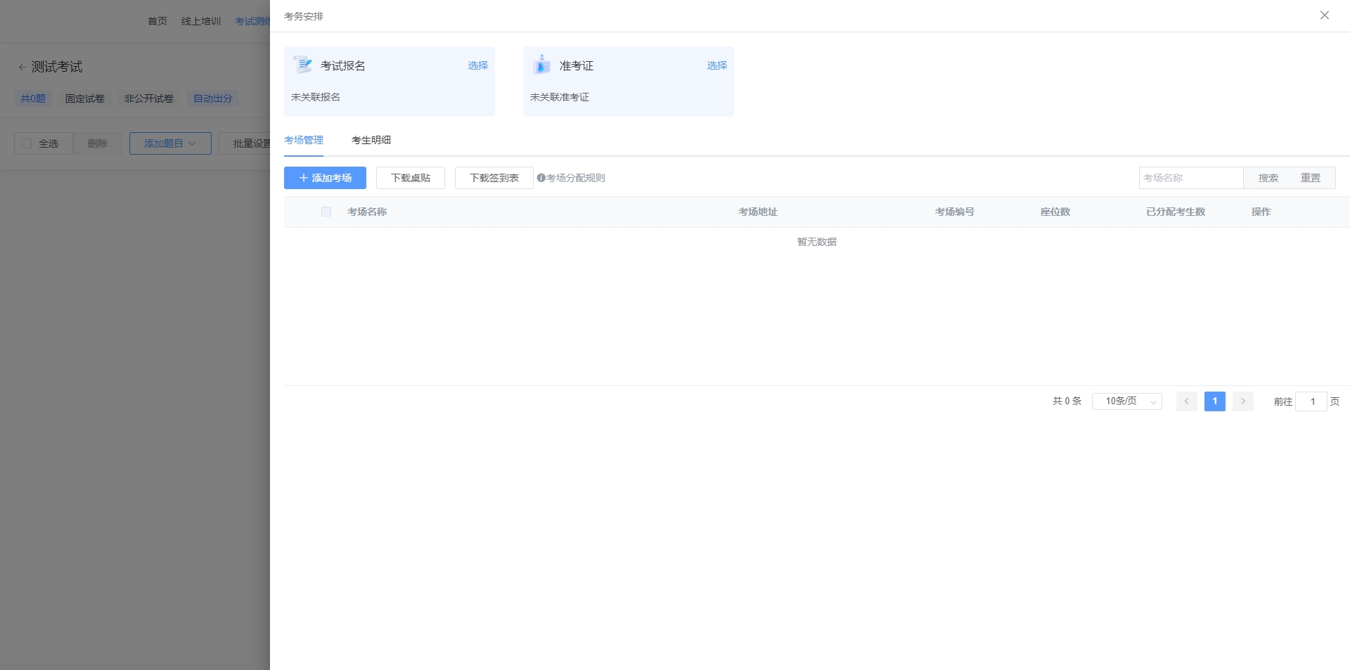 若在线下统一组织考试,则可以通过 考务管理 功能配置考场与准考证信息,供考试时审核查验。