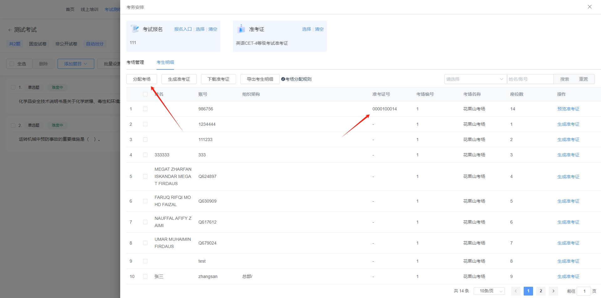 添加好考场和准考证后,被邀请加入考试的考生能够被分配考场和生成准考证,系统会根据预设的规则为每个考生分配考场及座位号。同时,根据已分配的考场和座位号生成准考证号。