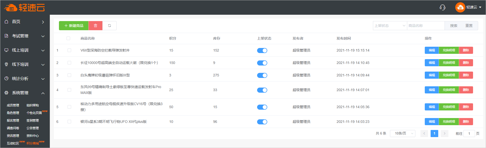 在管理端后台 系统管理 菜单下找到 积分商城 ,能够添加允许成员兑换的商品信息。