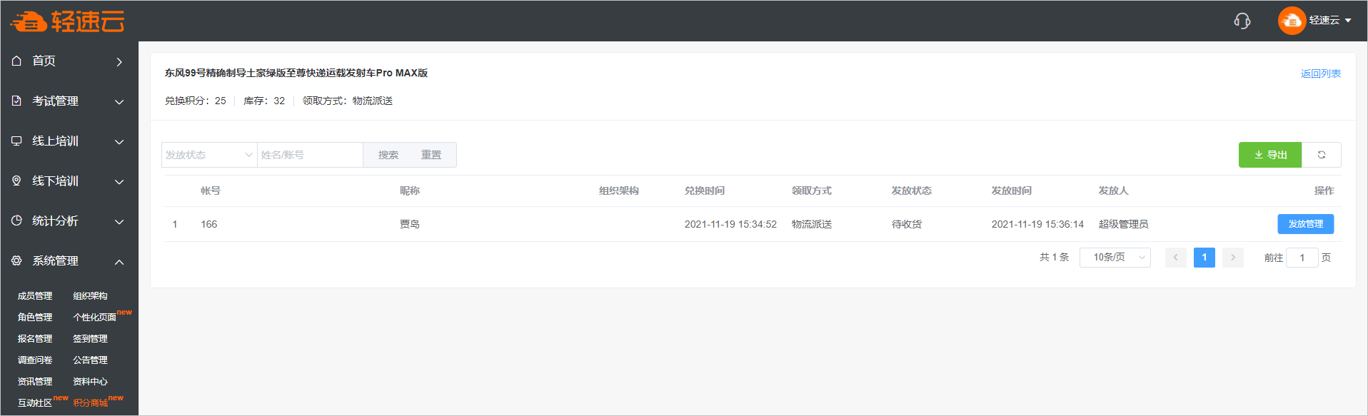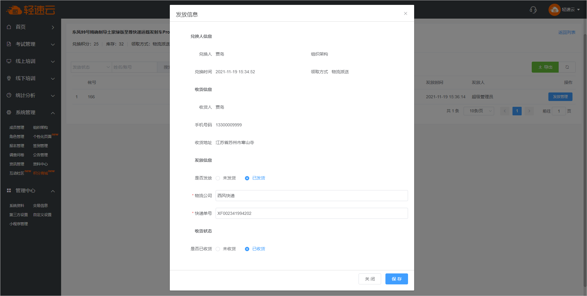 如果是物流配送的商品,创建快递订单后,则是将商品的发放信息设置为 已发放 ,并填写物流信息,便于成员及时了解物流状态。