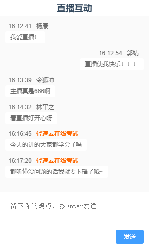 所有的直播参与者都可以通过直播互动聊天室发送文字信息。每个成员发送的文字内容都可以被其他所有正在观看直播的成员查看到。