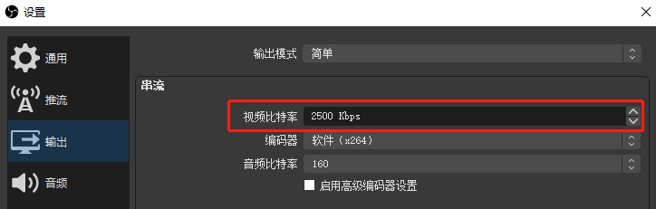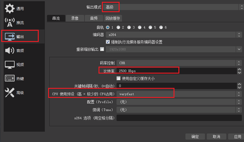 单击 输出 进入输入设置页面,按下图配置,此处需将 比特率 设置到最低。单击确定保存配置。