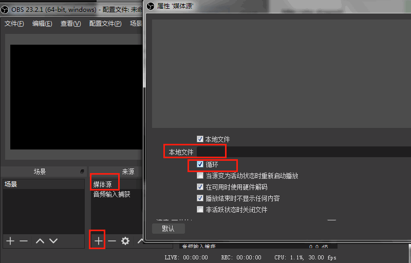 在底部工具栏的 来源 标签中,单击 + 添加 媒体源 ,在弹出框中的本地文件选择要轮播的视频文件,勾选 循环 ,然后保存即可。