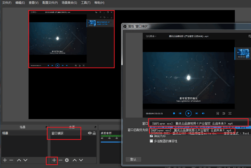 打开 OBS,在 来源 中单击 + 添加 窗口捕获 ,在窗口选项找到 QQPlayer.exe,捕获到对应播放内容,单击确定。
