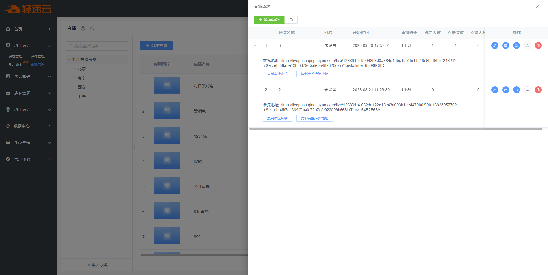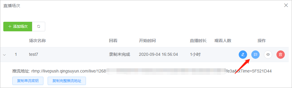点击直播列表中的 场次管理 来查看某个直播的场次信息。每一个直播场次都对应独立唯一的推流地址。
