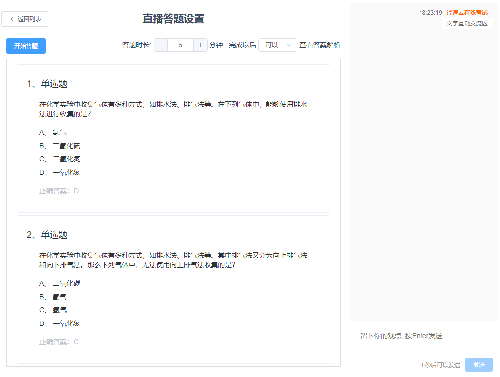 设置好答题时长以及是否允许查看答案,最后点击左上角 开始答题 按钮,即可将答题项目推送给正在收看直播的成员。