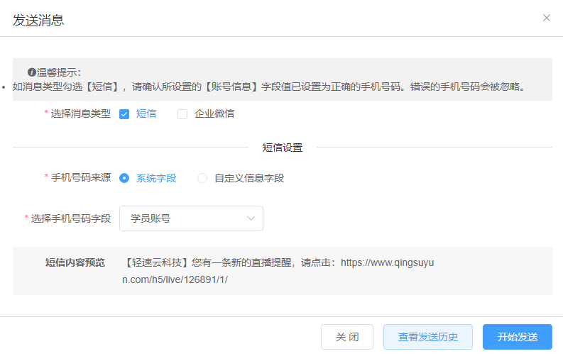 您需要预先使用账号或自定义信息来设置好成员的手机号码与邮箱。错误的信息会在发送短信或邮件时被系统自动过滤,而受邀观看直播且信息填写正确的成员均可收到对应直播消息提示。