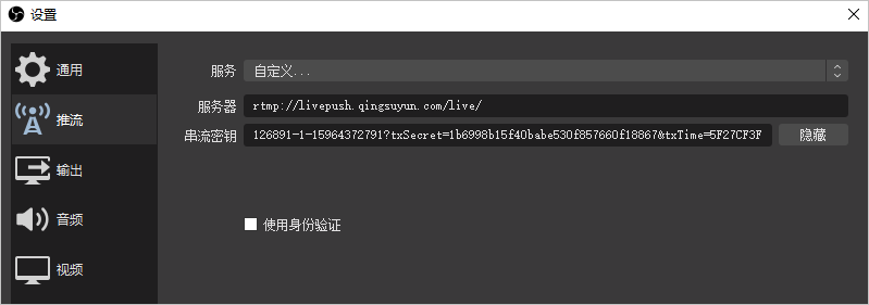 设置推流页面中的 服务器 和 串流密钥 项,开始推流即可实现单个文件轮播。