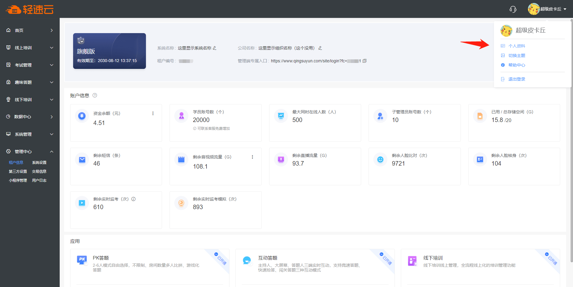 显示您的剩余流量。成员在进行某些动作时可能会消耗该流量,如在线学习或考试中播放的音视频文件。当剩余流量不足时,成员将无法执行对应动作。