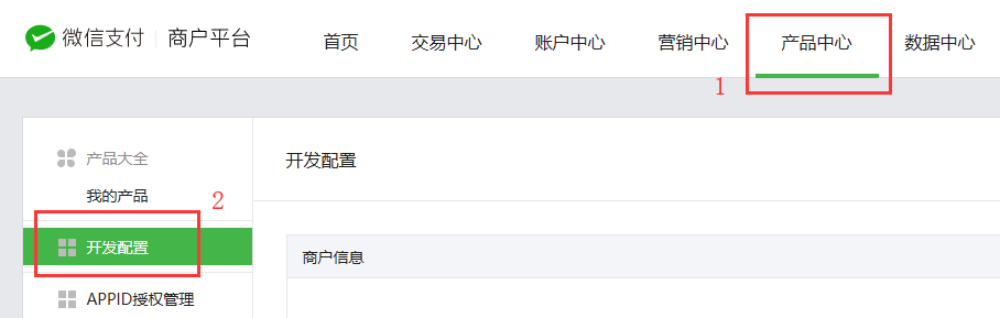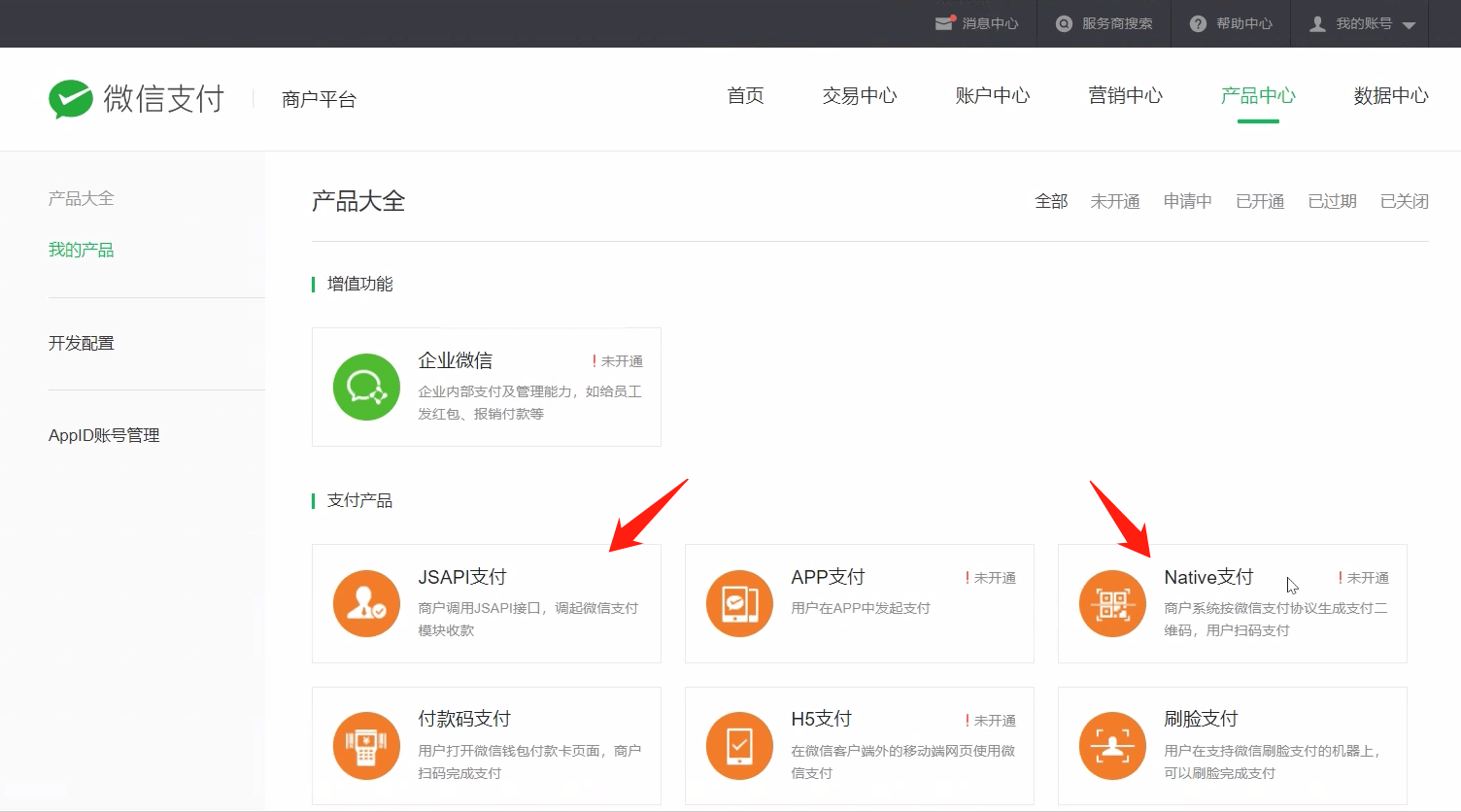 登录 微信商户平台 ,点击顶栏菜单 产品中心 ,进入产品中心之后点击左侧菜单 我的产品 。