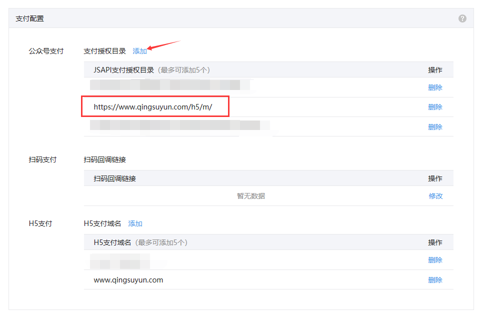 支付授权目录,在需要配置的的支付方式中点击添加,输入支付目录地址: