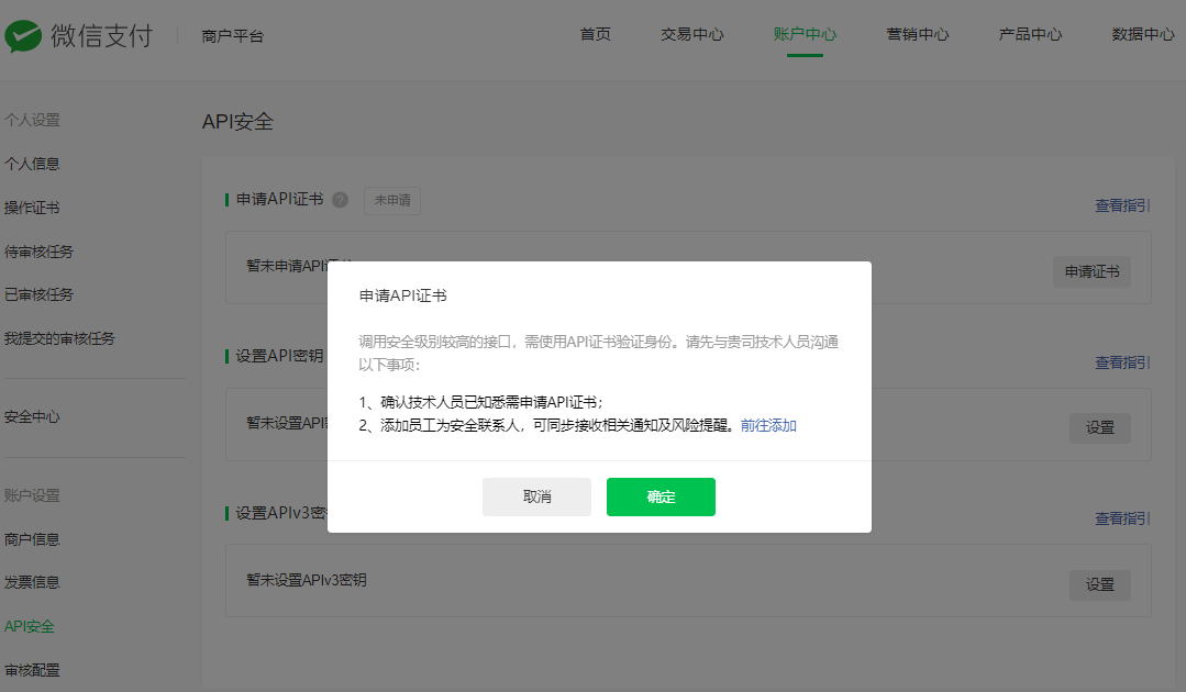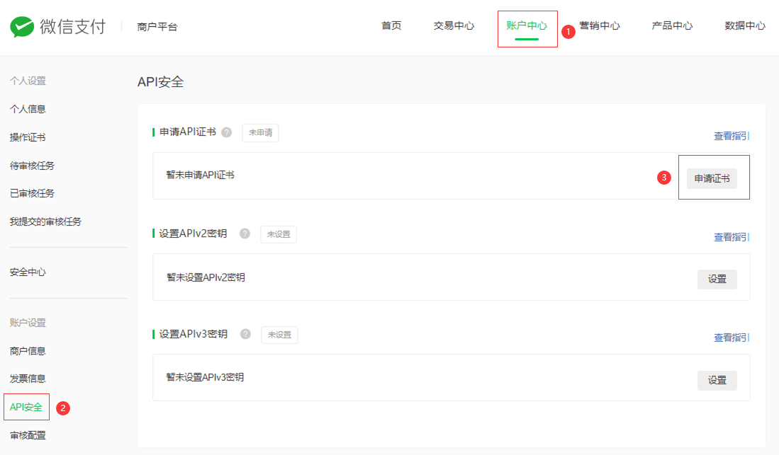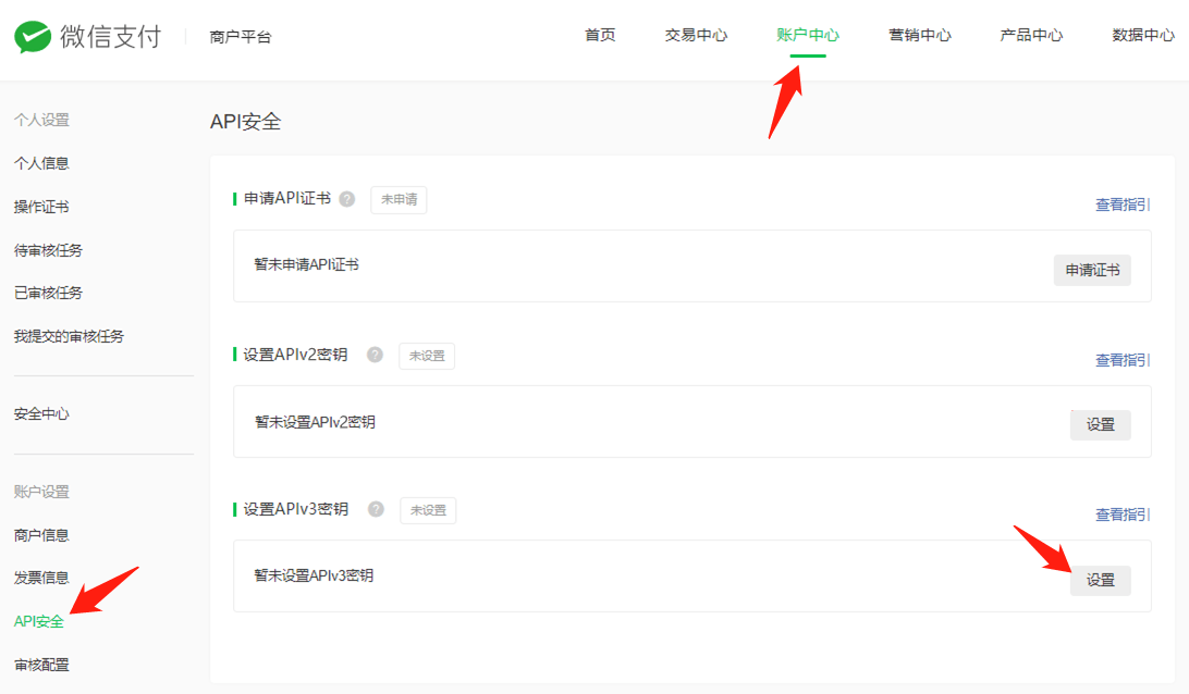 登录 微信商户平台 ,点击顶栏菜单 账户中心 ,进入账户中心之后点击左侧菜单 API安全 。