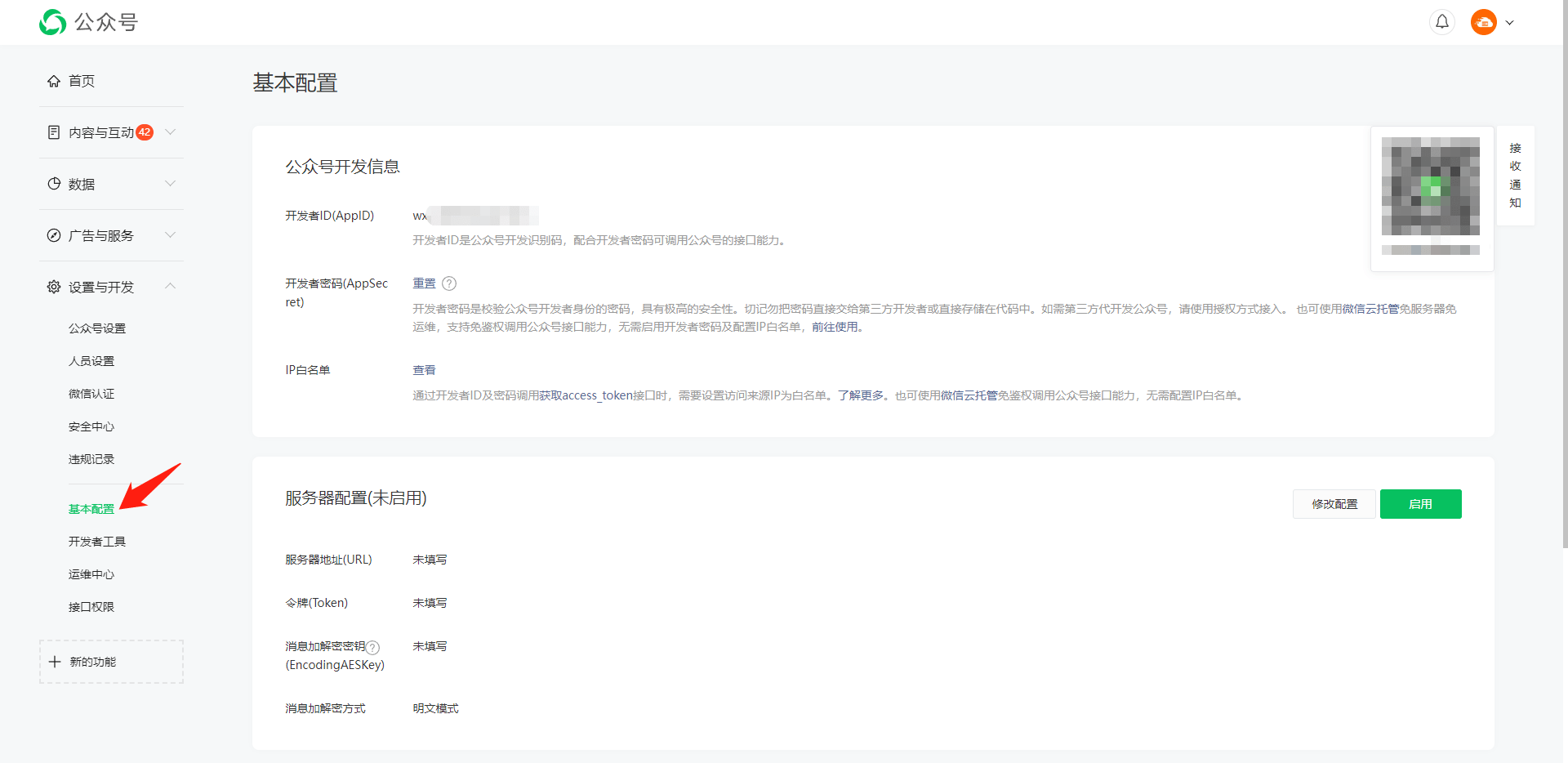 登录 微信公众平台 ,进入公众号管理后台,点击左侧菜单 设置与开发 - 基本配置 。
