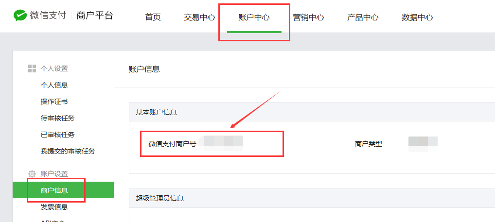 登录 微信商户平台 ,点击顶栏菜单 账户中心 ,进入账户中心之后点击左侧菜单 商户信息 :