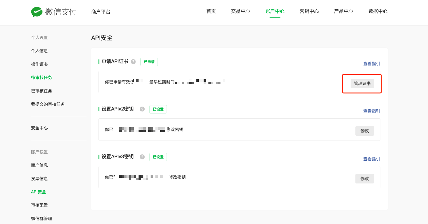 如已经按照上述流程生成API证书,则点击 管理证书 ;如未生成,请先生成证书。