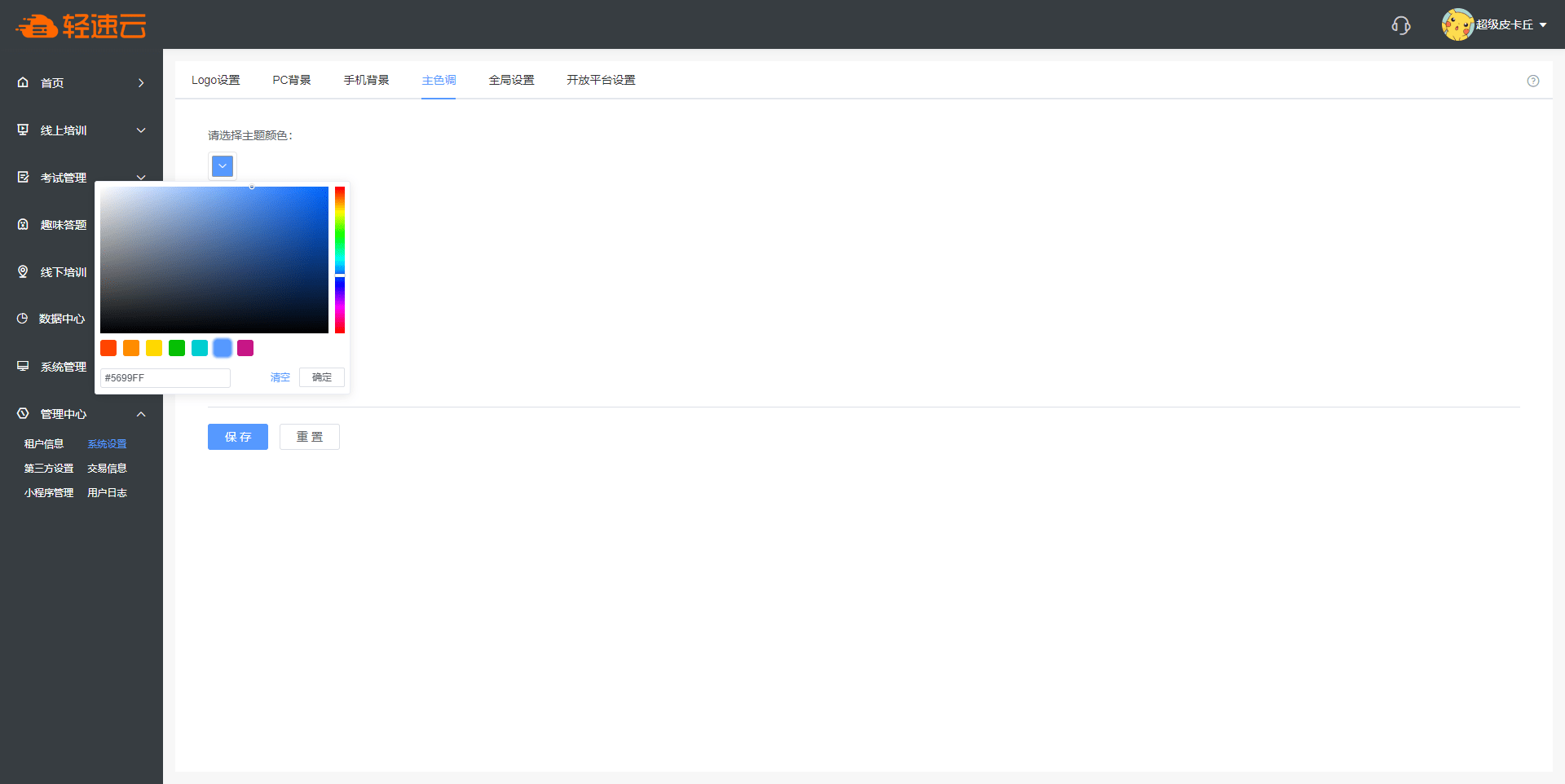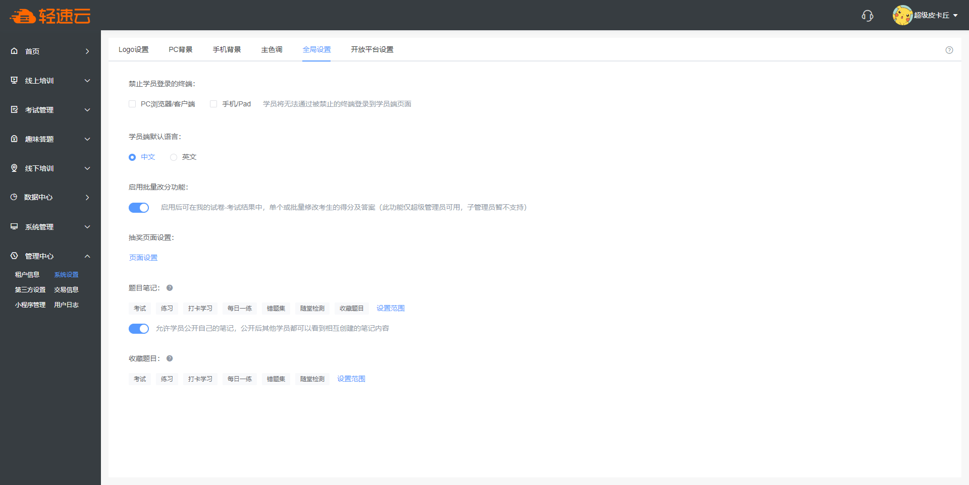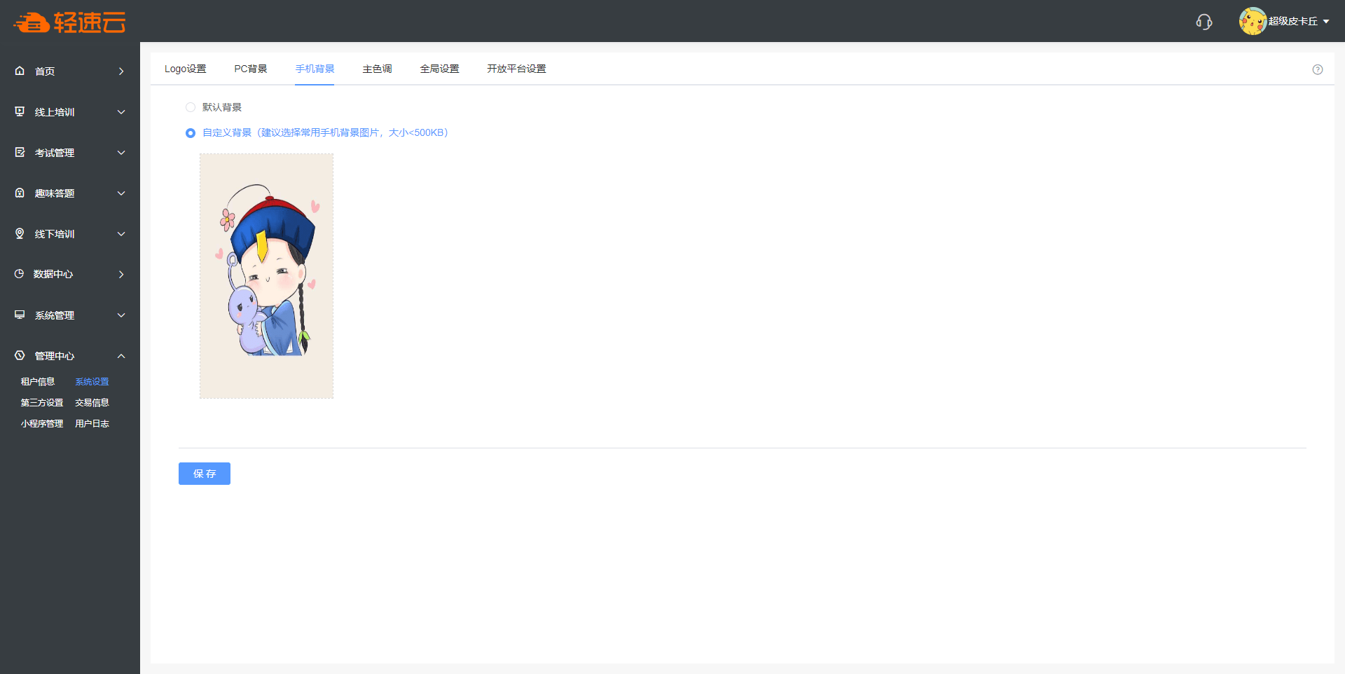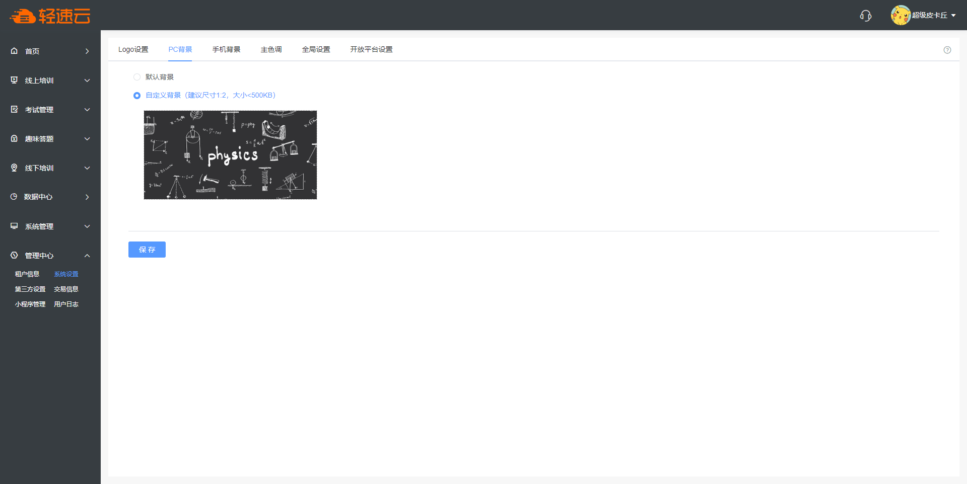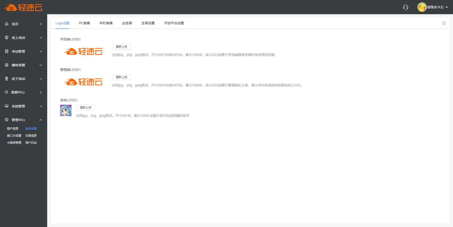 您可在此页面设置管理员、学员端以及系统logo,直接上传对应尺寸的logo图片即可,设置会实时生效。
