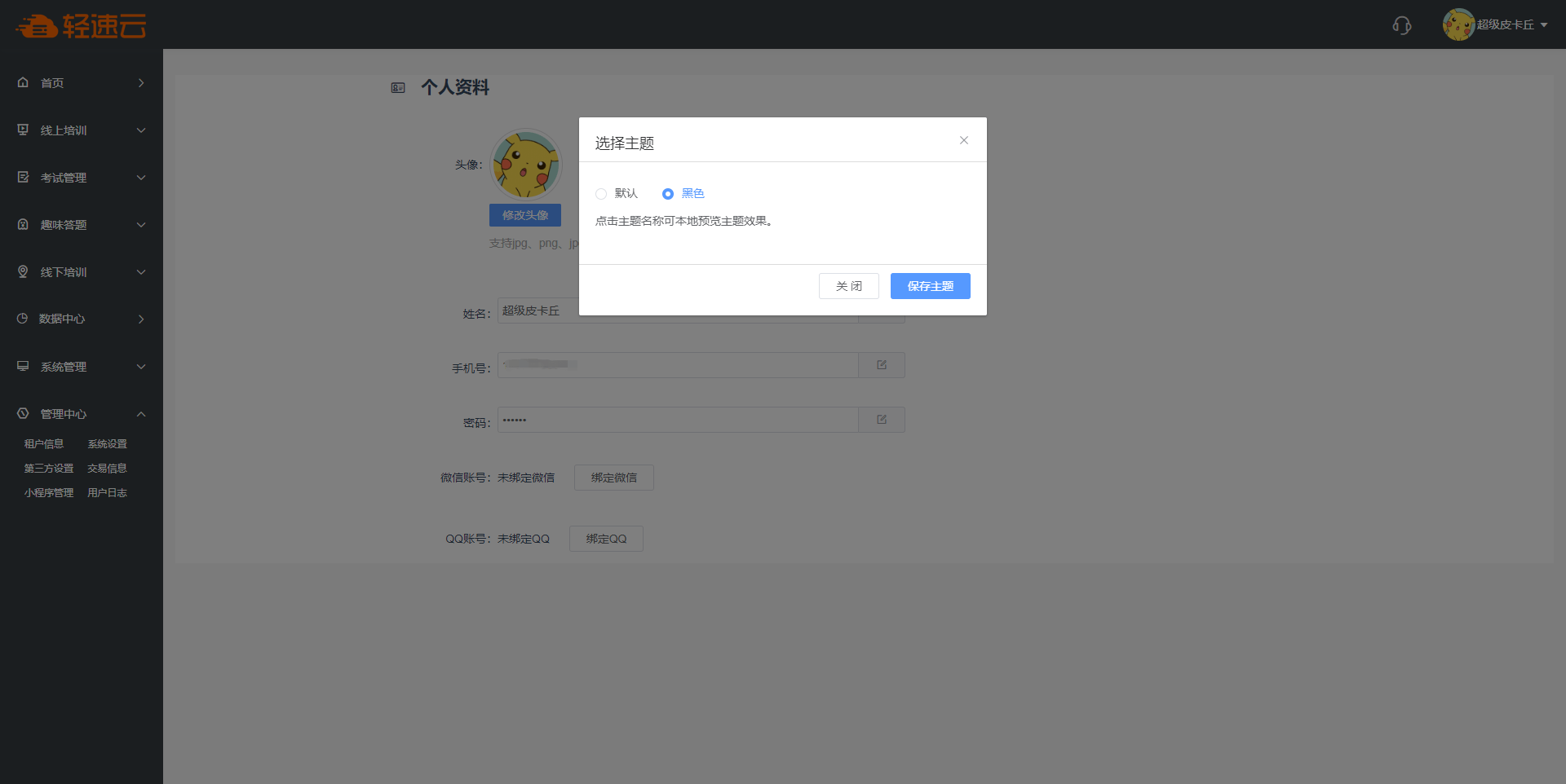 在系统管理后台点击右上角管理员信息,然后选择 个人资料 会进入到个人资料管理页面,可管理的信息为:头像、姓名、手机号、密码、绑定微信、绑定QQ。