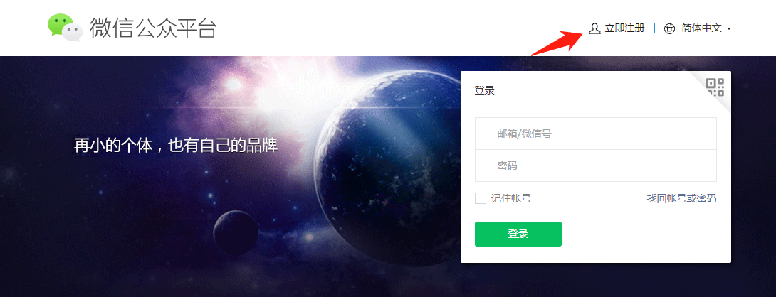 访问 微信公众平台 ,点击右上角 立即注册 按钮。