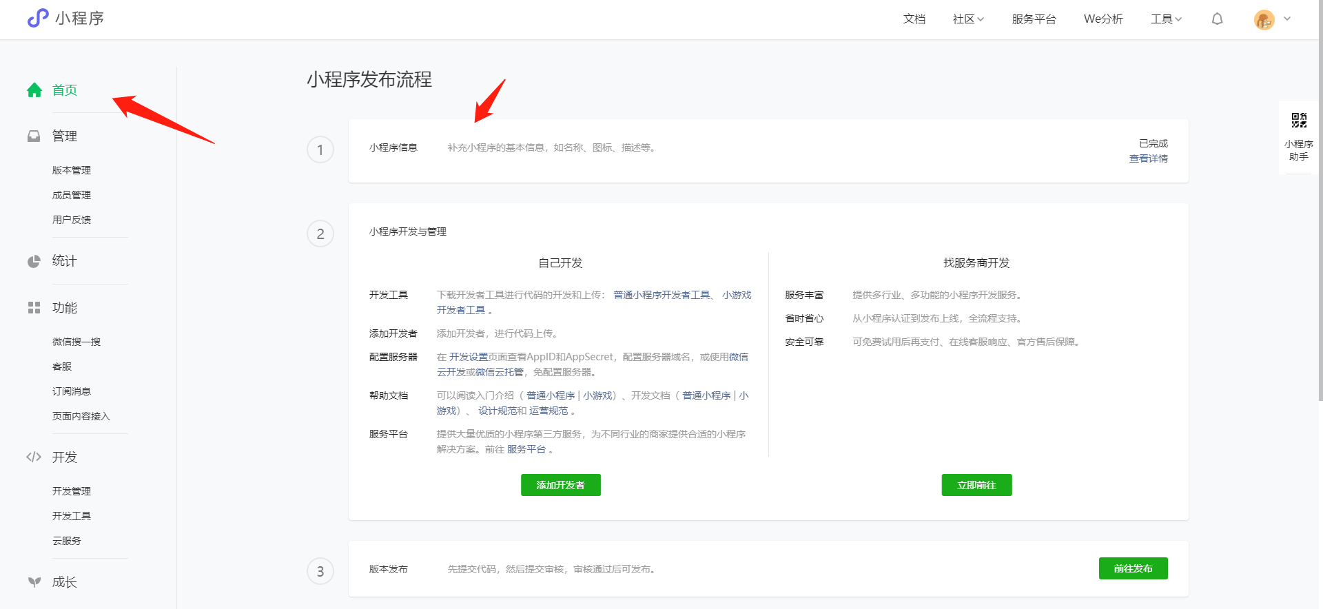 登录 微信公众平台 ,进入小程序管理后台,点击左侧菜单 开发 - 开发管理 。