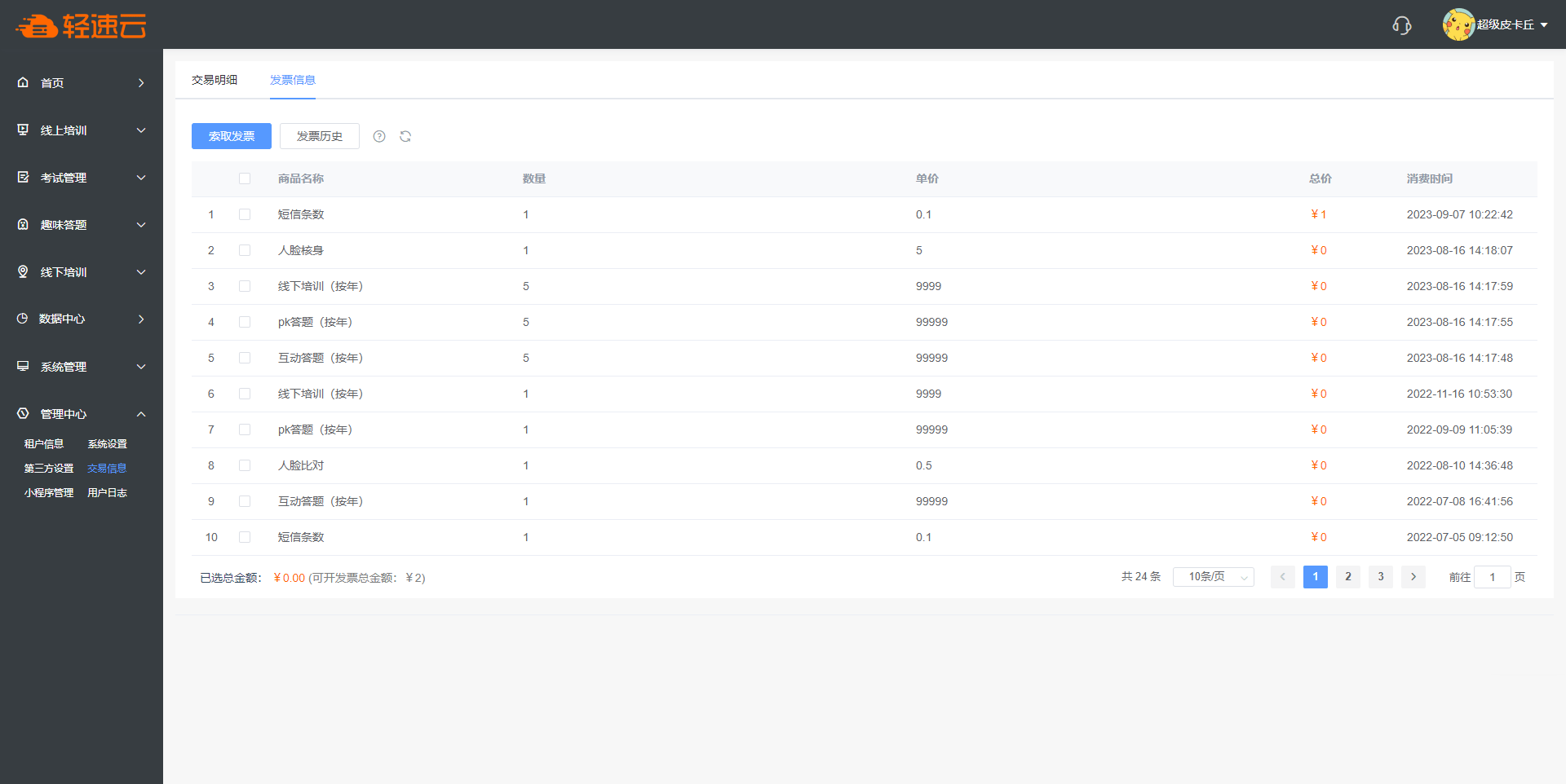 您可以点击顶部的 发票信息 切换到发票信息管理页面来索取发票。未开票的购买记录会直接显示在列表,可以勾选需要开票的购买信息,如图: