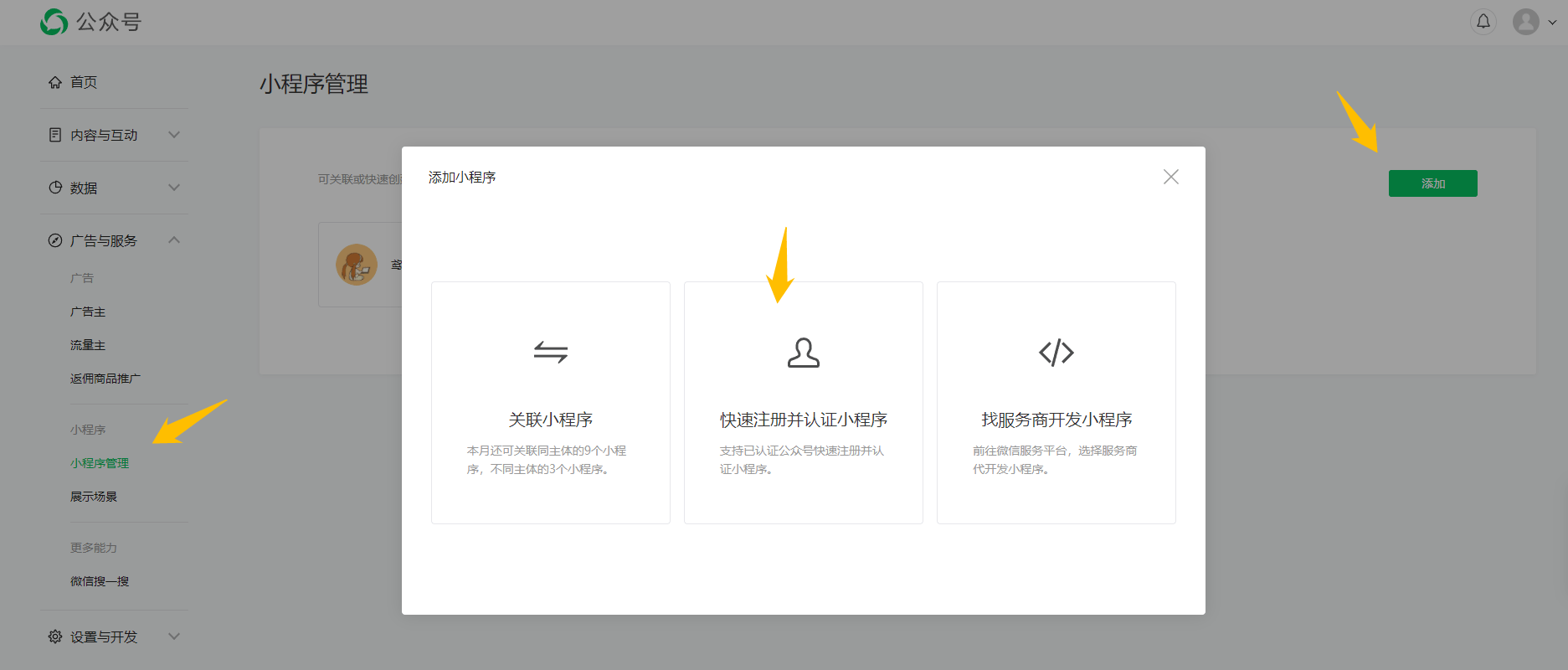 访问 微信公众平台 ,登录到您的微信公众号管理后台,点击 广告与服务 - 小程序管理 ,然后快速注册小程序。