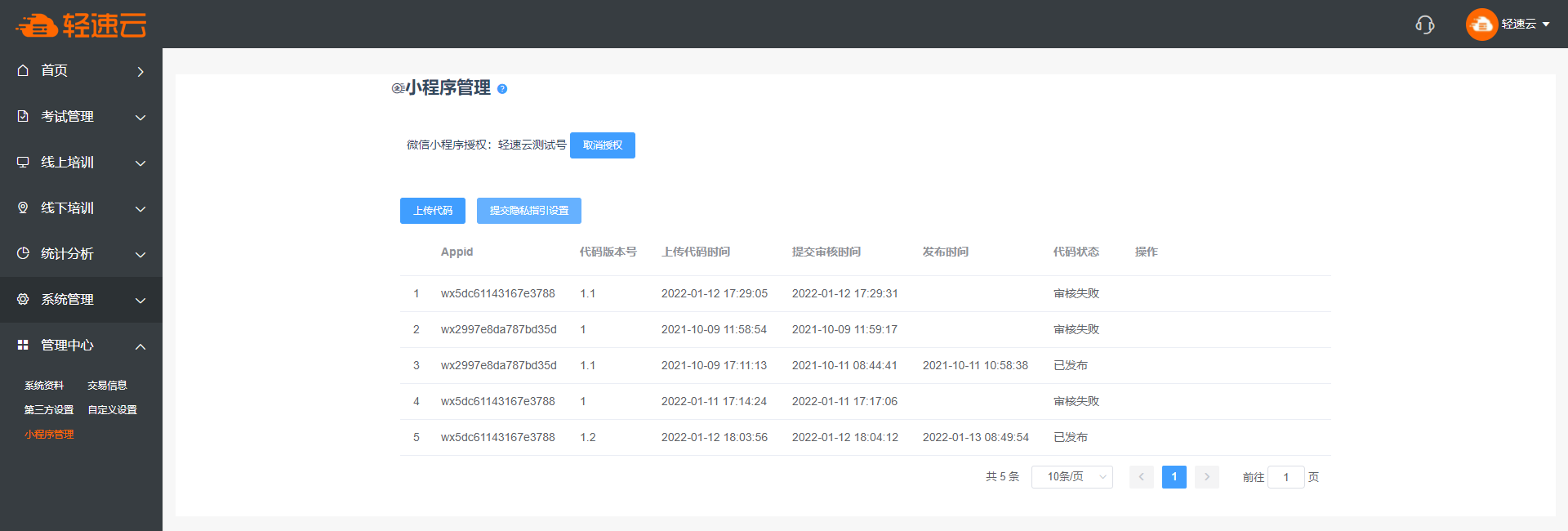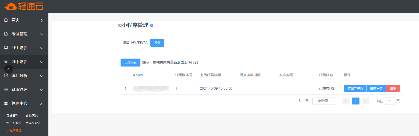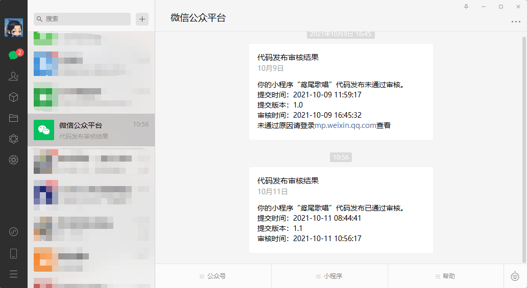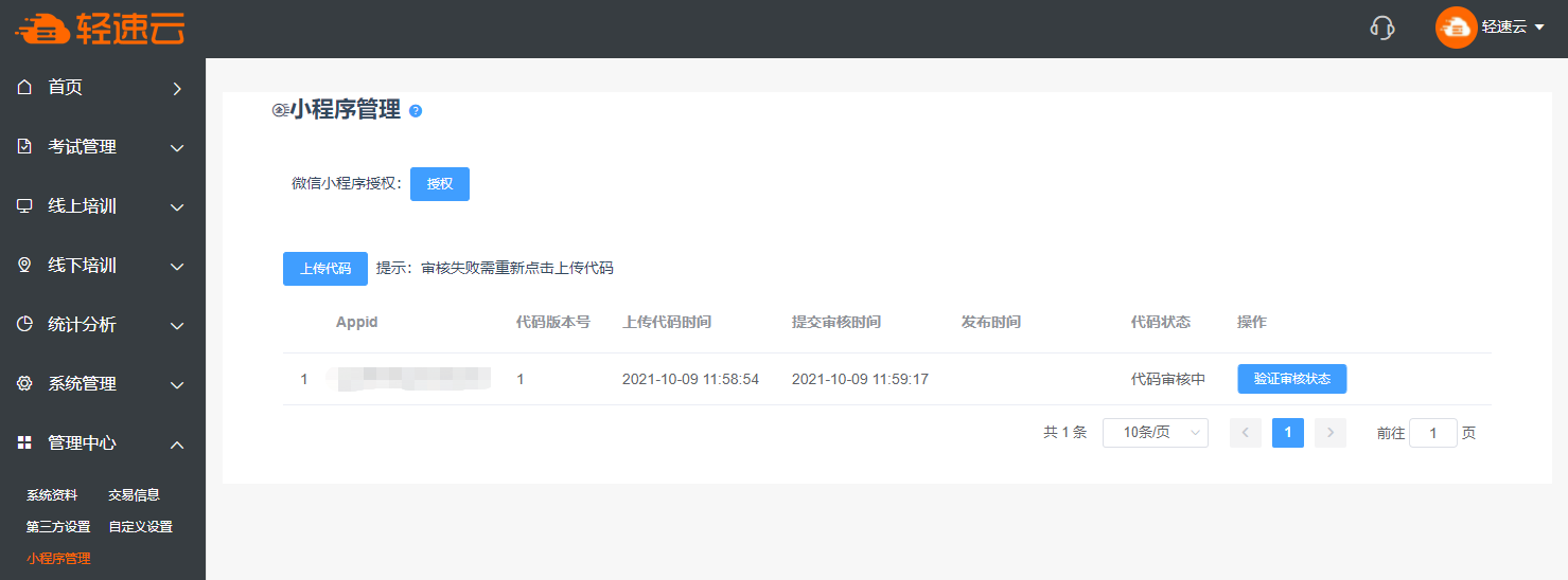 请耐心等待微信公众平台审核,并保持及时关注。若审核失败,下次提交审核时需要重新上传代码。