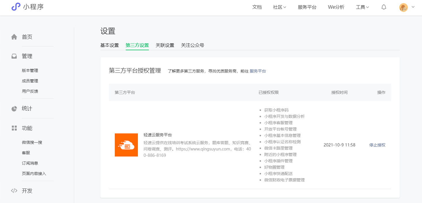 您可以通过小程序管理后台终止对kaiyun体育官方网站手机网的授权。