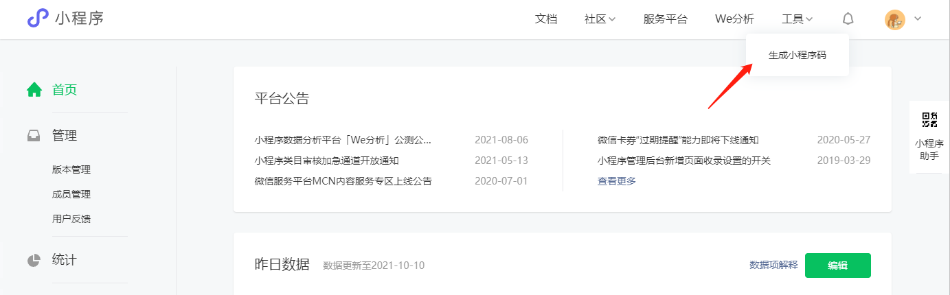进入微信公众平台小程序管理后台,点击 工具 - 生成小程序码 。