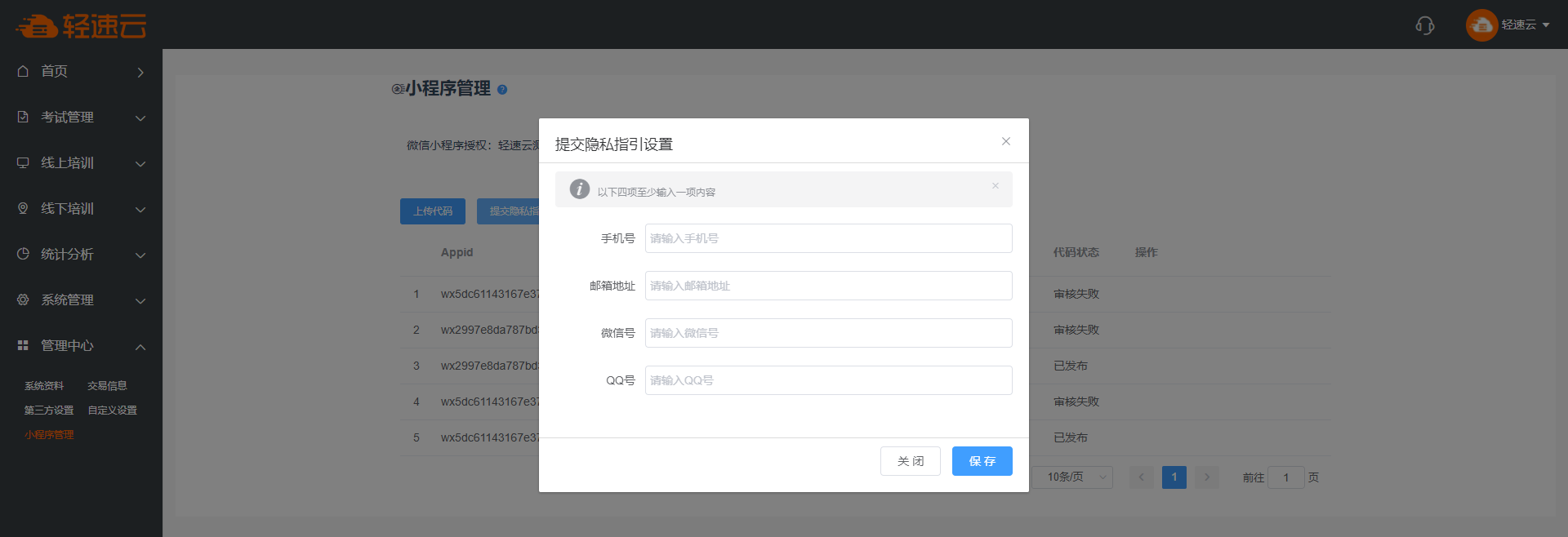 点击 提交隐私指引设置 ,会弹出隐私信息补充窗口,请填写您的小程序管理员的相关信息,kaiyun体育官方网站手机网会将此信息提交给微信公众平台,使您完成小程序的隐私设置。