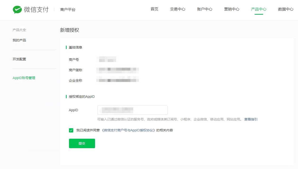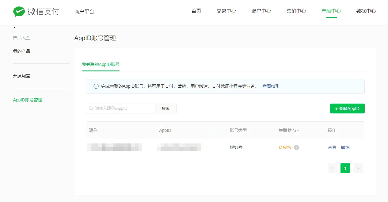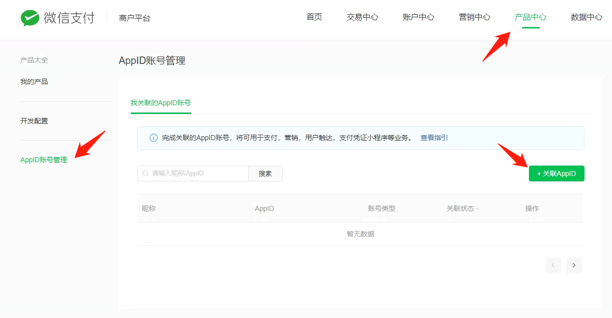 登录到微信商户平台,点击顶栏菜单 产品中心 ,然后点击左侧菜单 AppID账号管理 ,再点击 +关联AppID 。