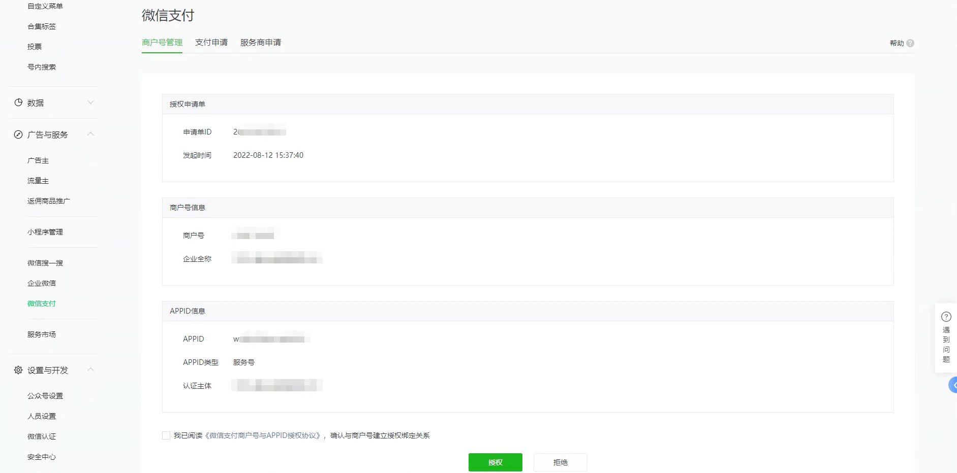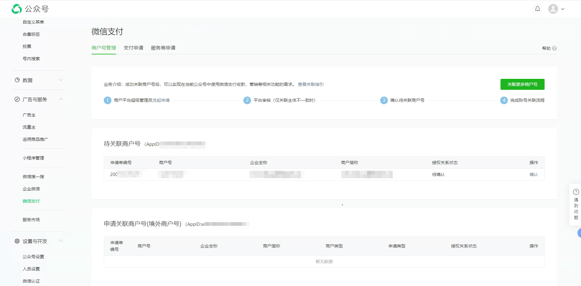 点击 查看 会跳转到微信公众平台,点击左侧菜单 微信支付 ,在 商户号管理 页面中会查看到待关联的商户号信息。